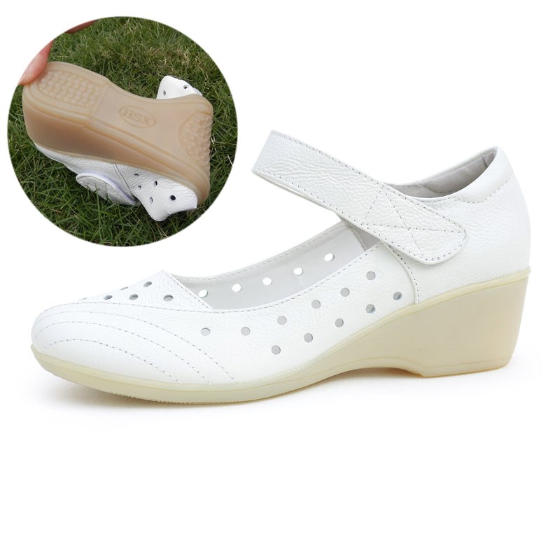 新款镂空洞洞鞋坡跟牛筋底白色真皮护士鞋春夏女凉鞋小Y码33 34