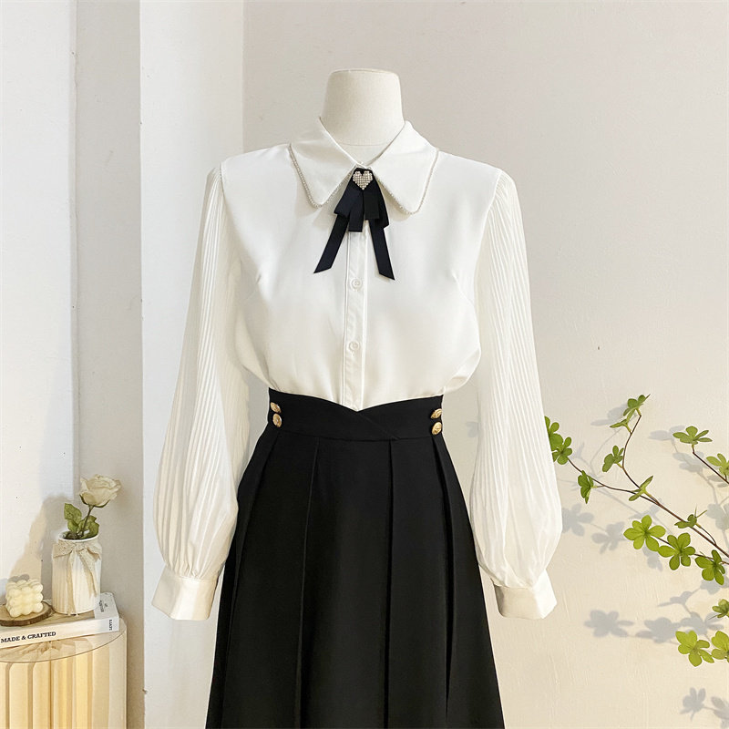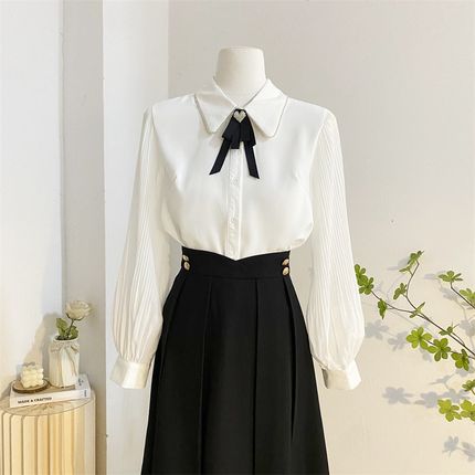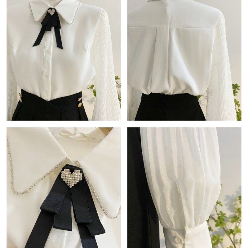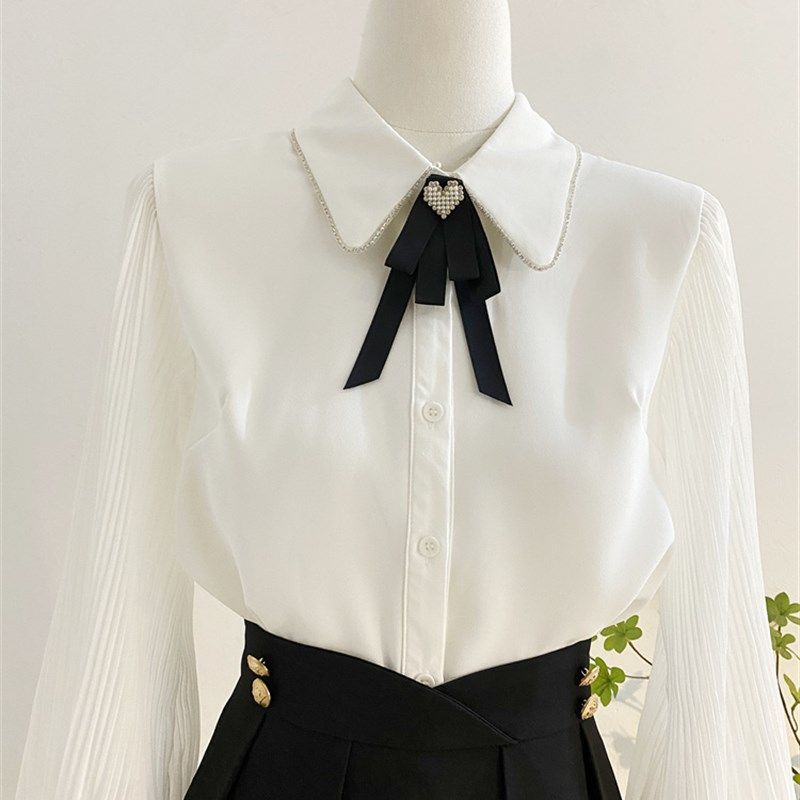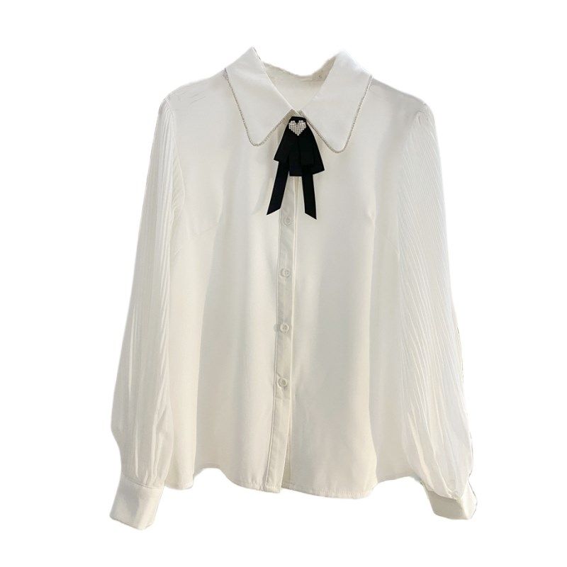 白色蝴蝶结长袖衬衫女秋设计感褶皱灯笼袖雪纺衫洋气打底小衫上衣
