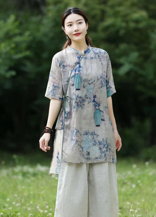 外贸出口大牌折扣女装文艺复古国风斜襟印花苎麻旗袍连衣裙茶服女