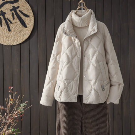 冬季立领白鸭绒羽绒服女款2024年新款韩版菱格休闲防风纯色短外套