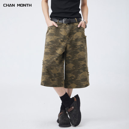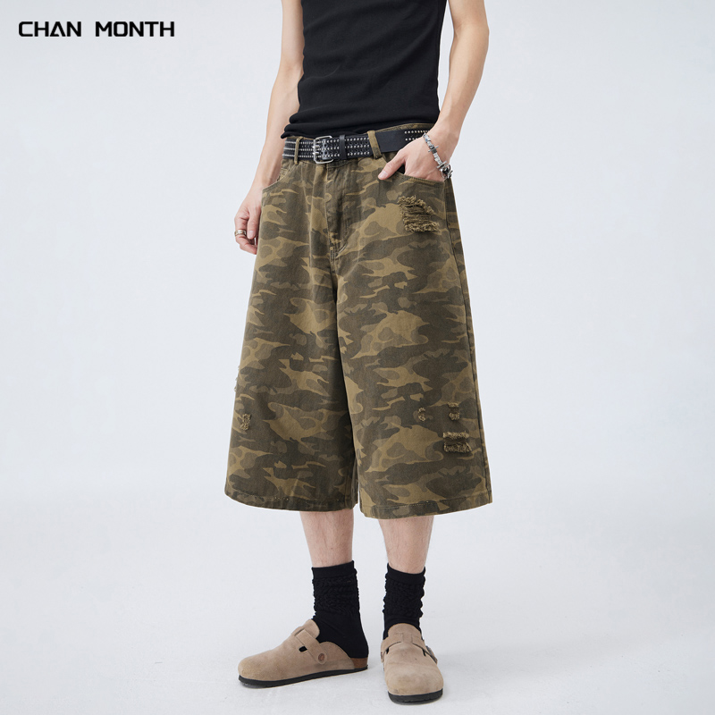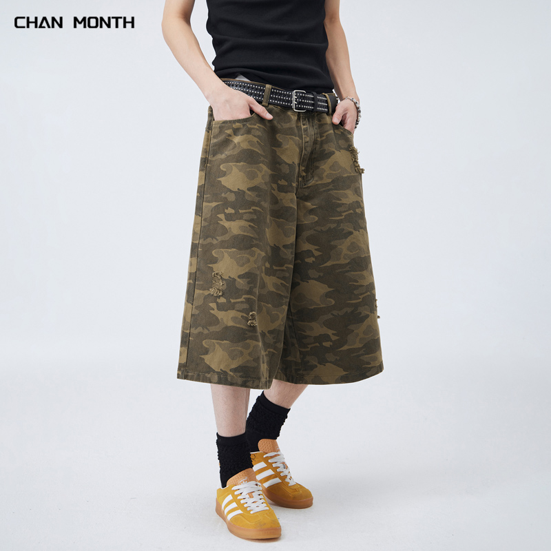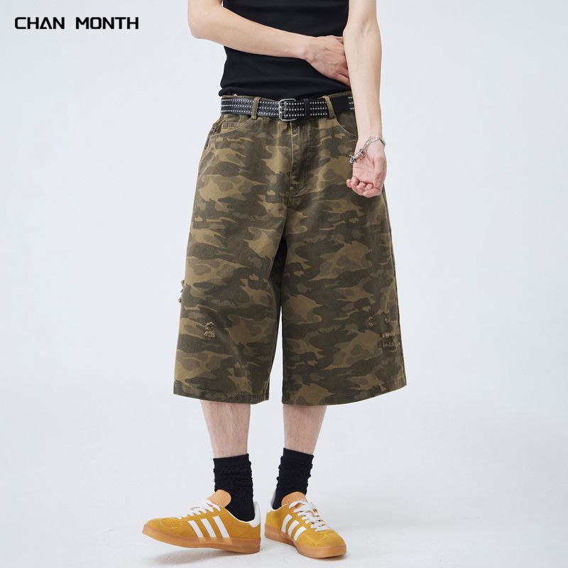 CHAN MONTH美式复古迷彩工装七分短裤夏季休闲阔腿宽松直筒男裤