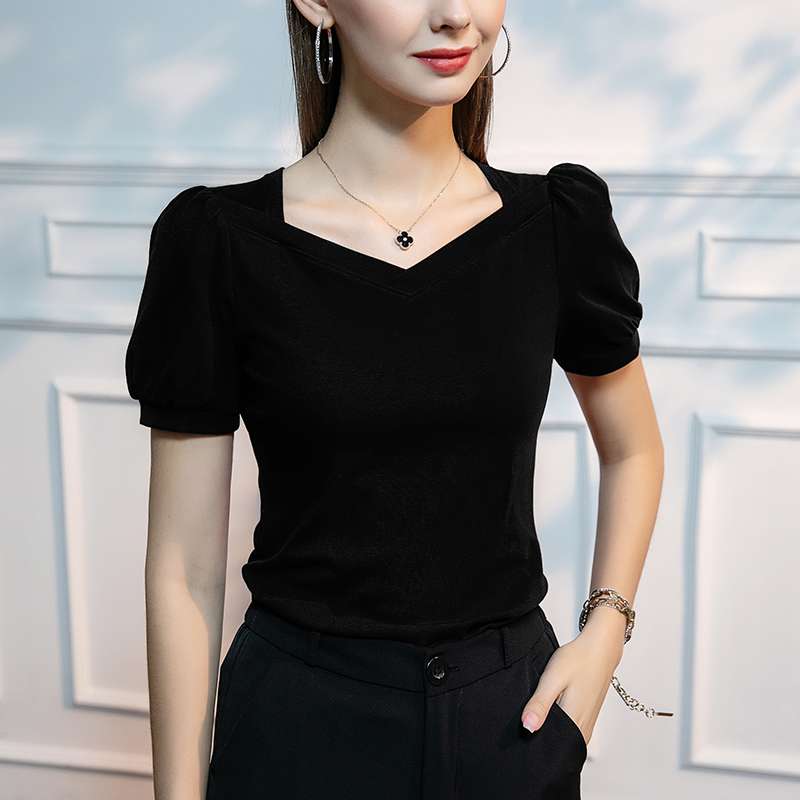 2025秋季法式方领T恤女短袖棉t公主袖女装时尚上衣泡泡袖小衫