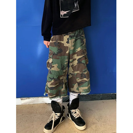 vintage街头迷彩风格牛仔短裤男款夏季美式复古宽松阔腿七分裤子