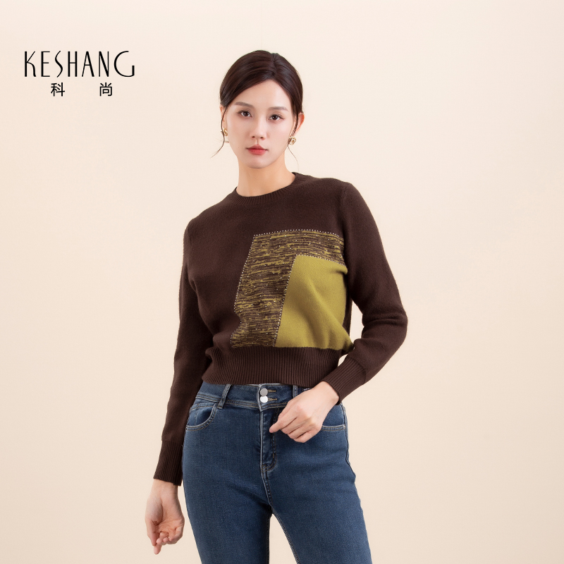 科尚套头圆领针织衫女2025冬装新款时尚印花针织上衣显瘦宽松毛衣