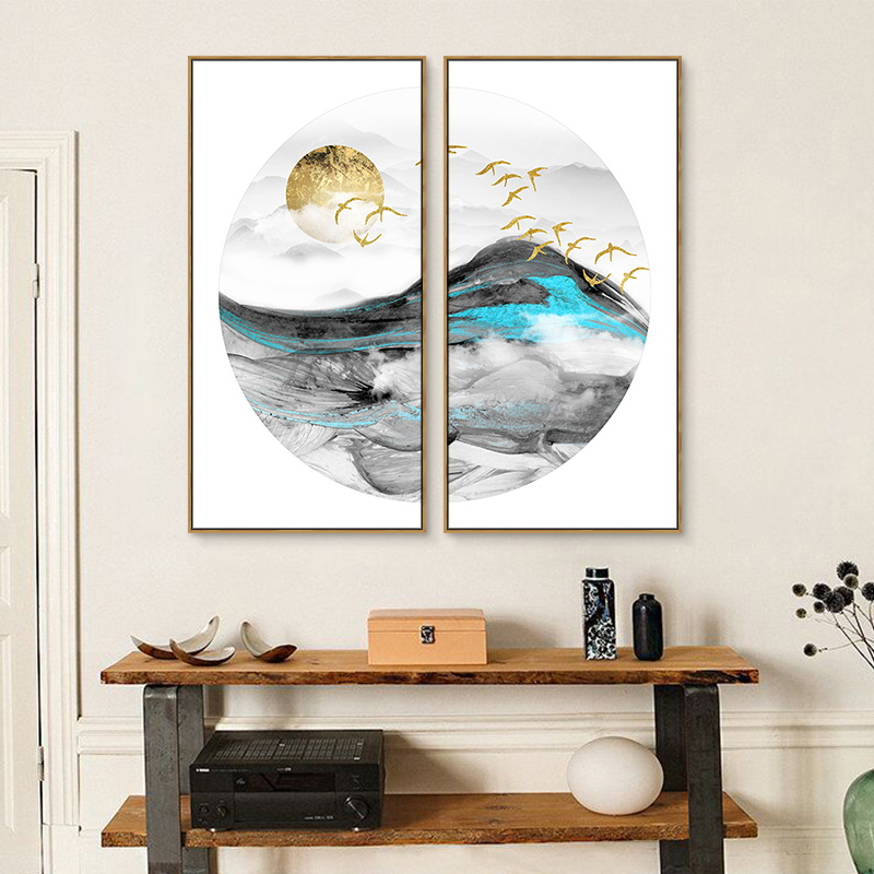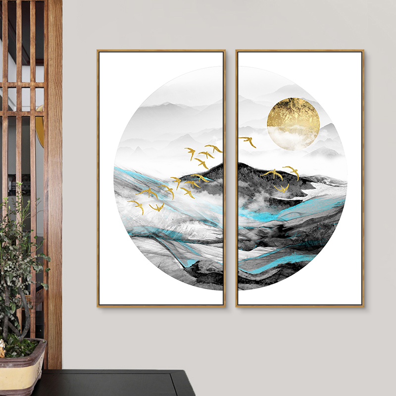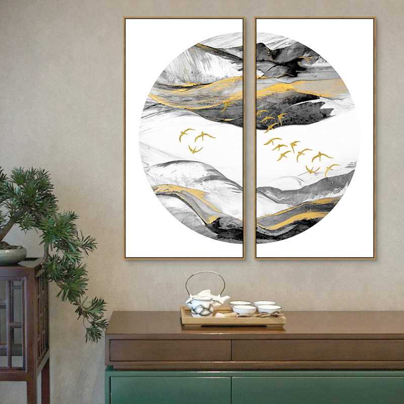 金色抽象山水玄关装饰画客厅挂画风水现代轻奢新中式靠山圆形墙画