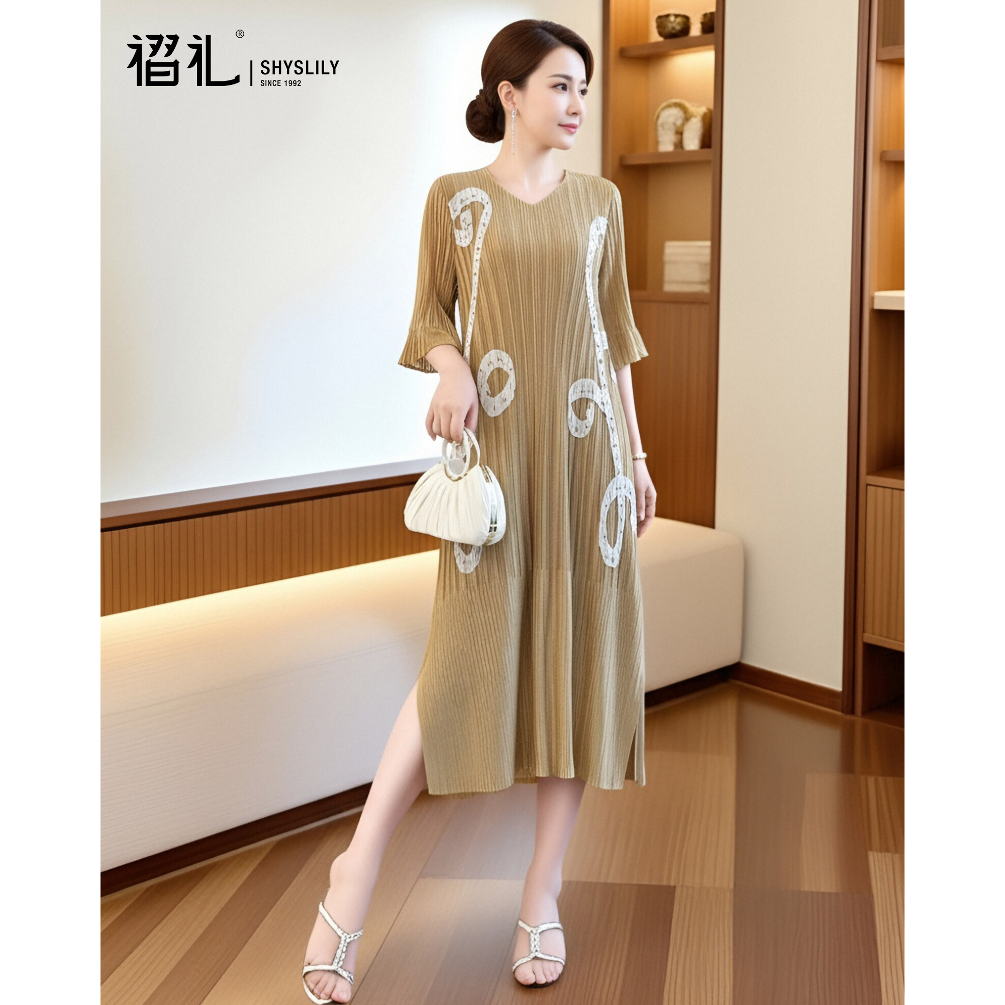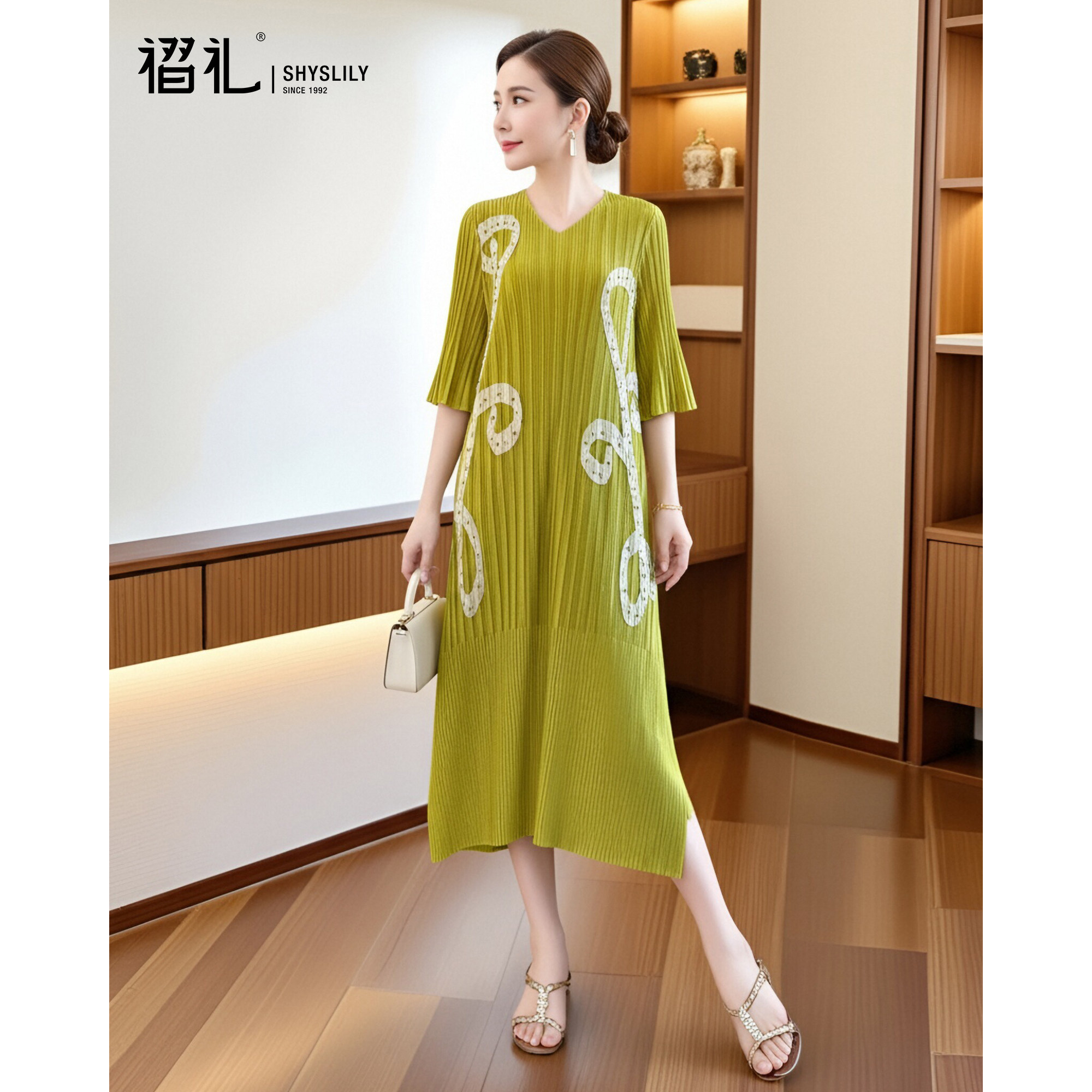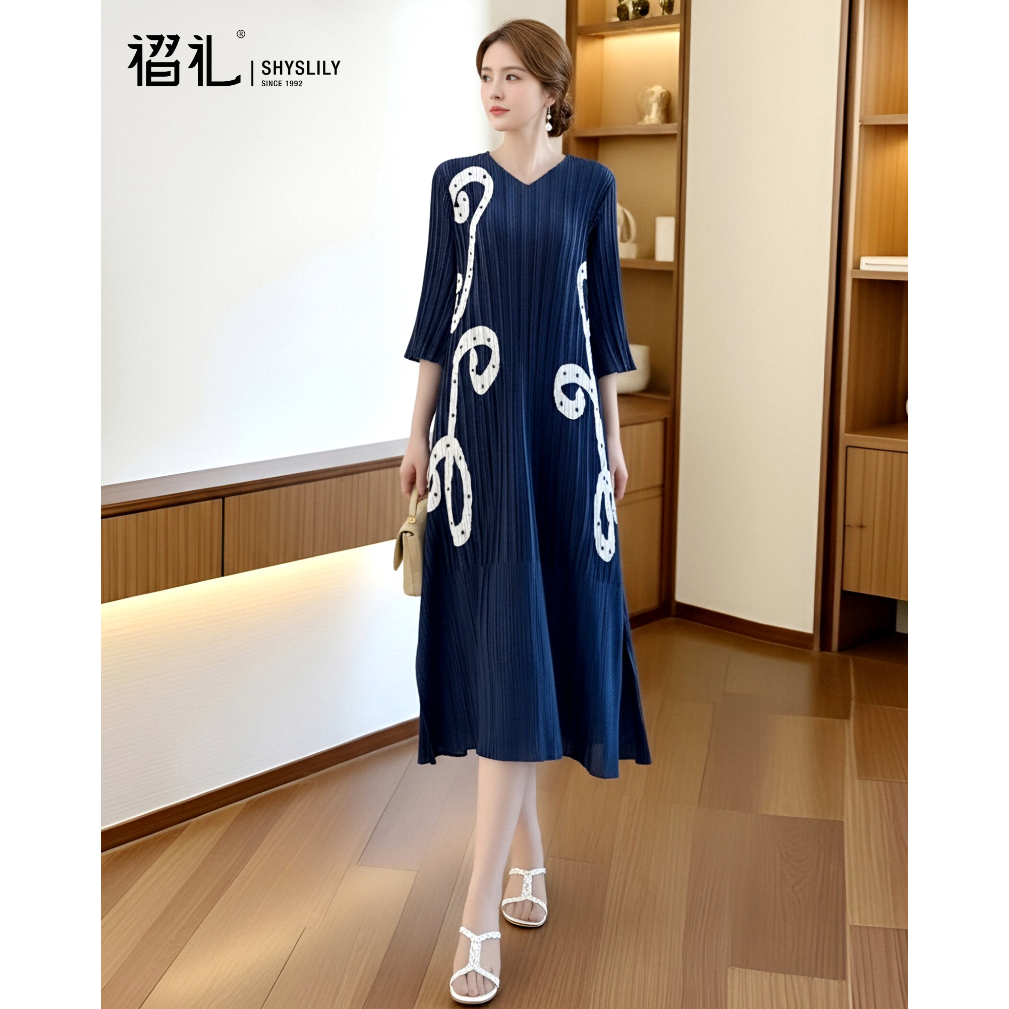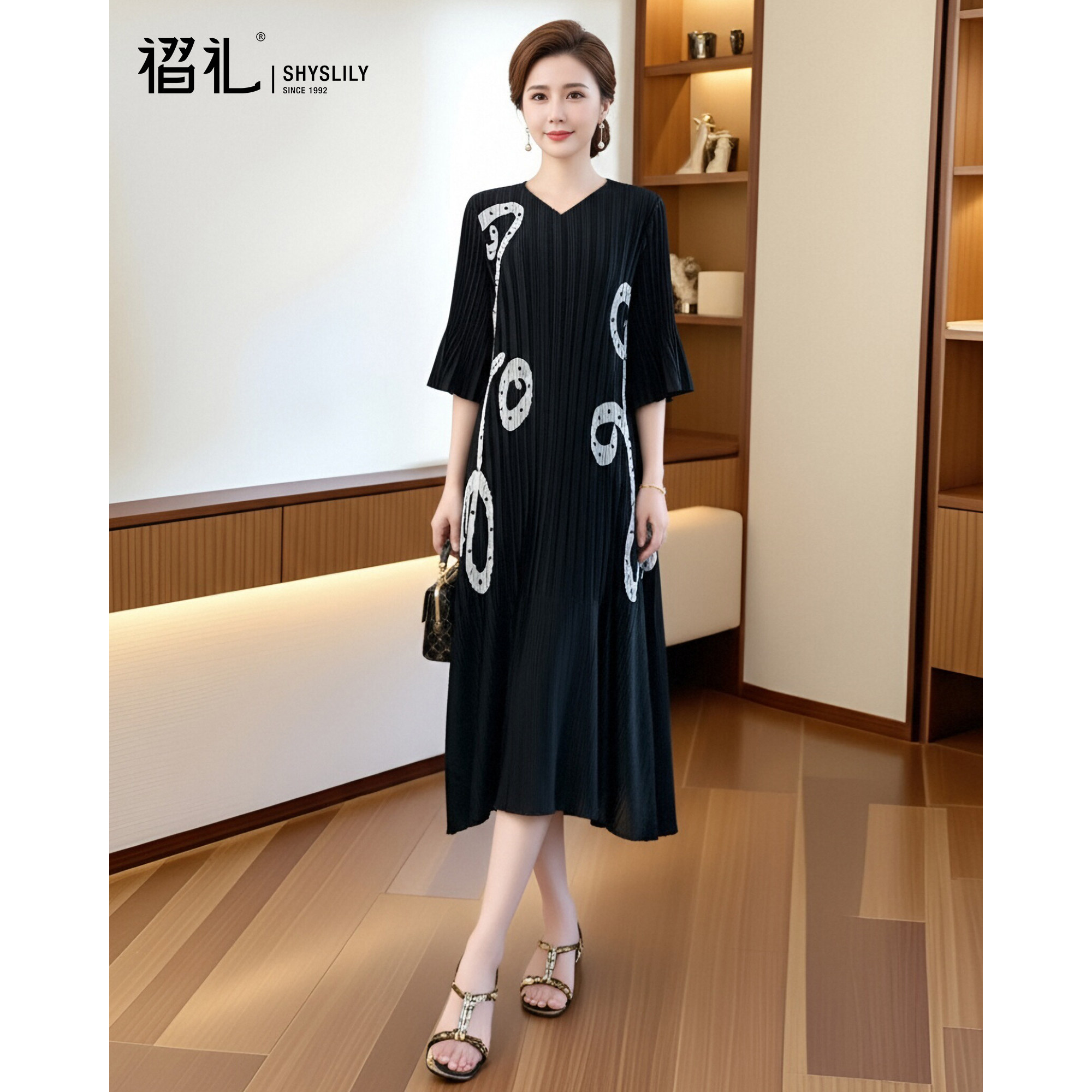 三宅褶皱红色裙子春季2026新款气质年轻妈妈连衣裙宽松大摆裙洋气