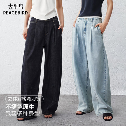 太平鸟高腰阔腿弯刀牛仔裤26夏新款宽松显瘦不褪色原牛杨桃牛仔裤