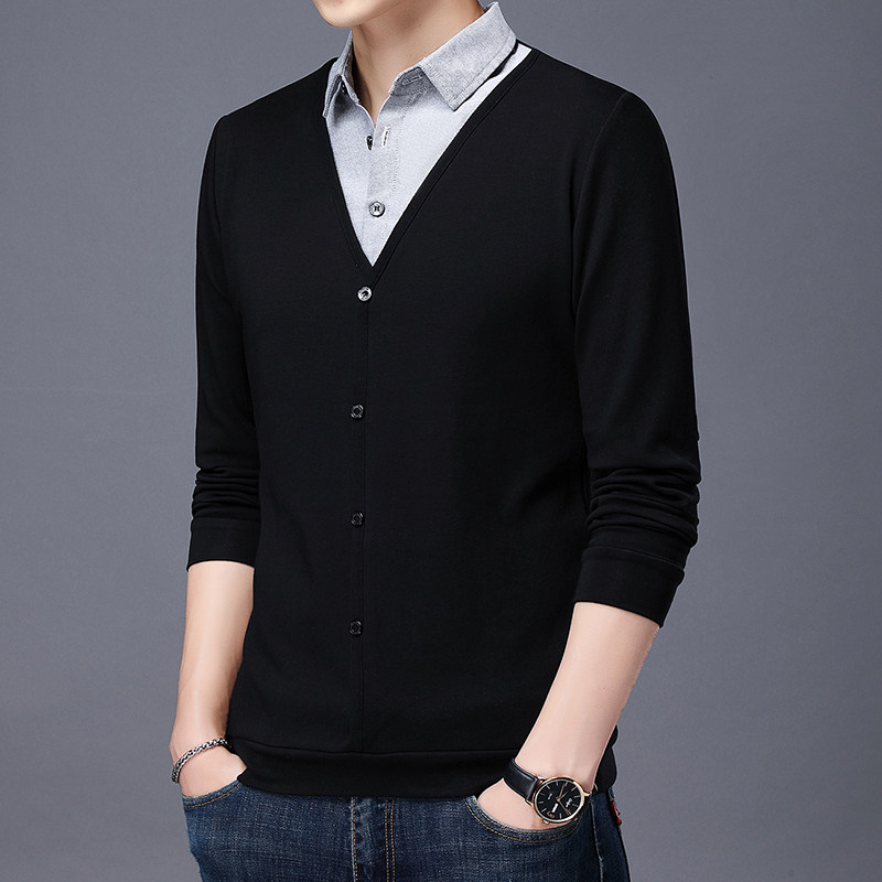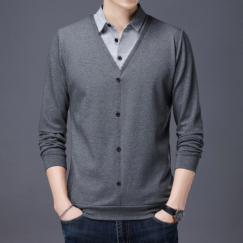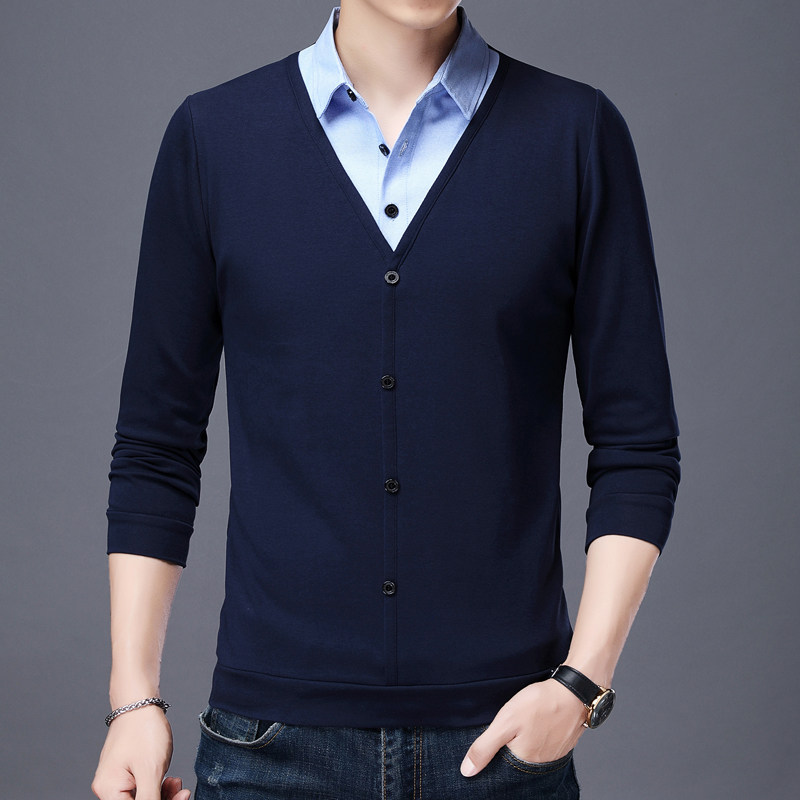 秋季衣服长袖T恤男宽松衬衫领假两件男装上衣中年小衫加大码秋衣