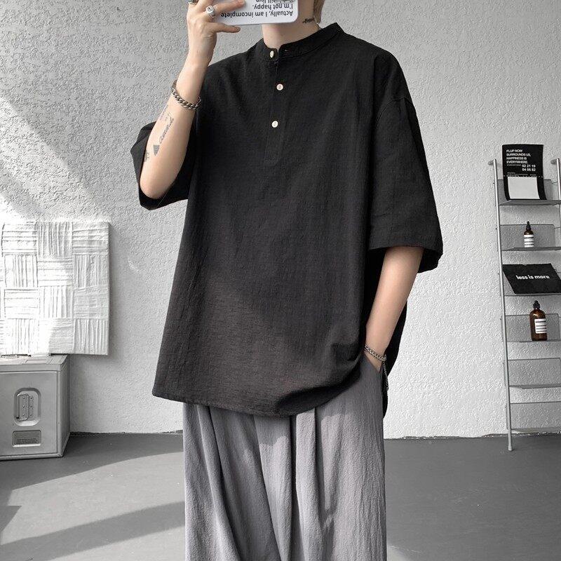 中国风亚麻短袖男加肥加大码亨利领T恤新中式男装夏季棉麻半袖衫