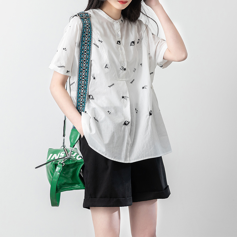 白色刺绣圆领短袖衬衫女