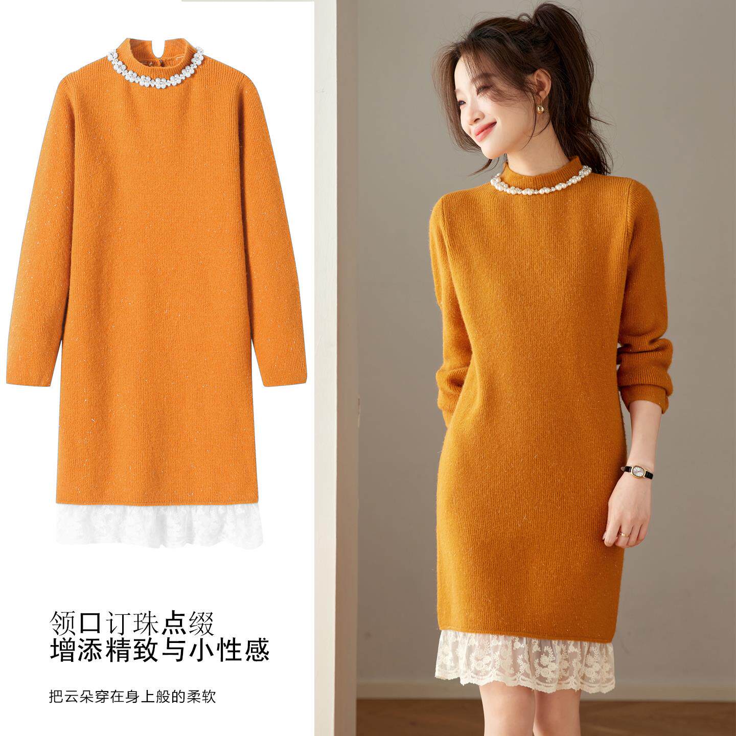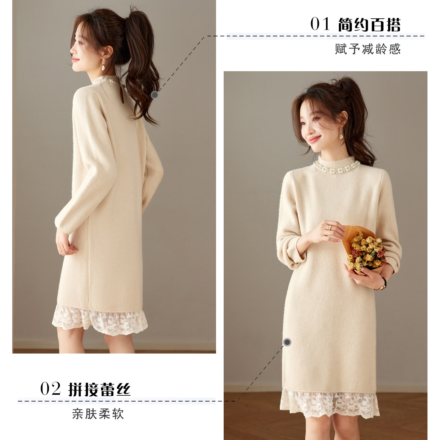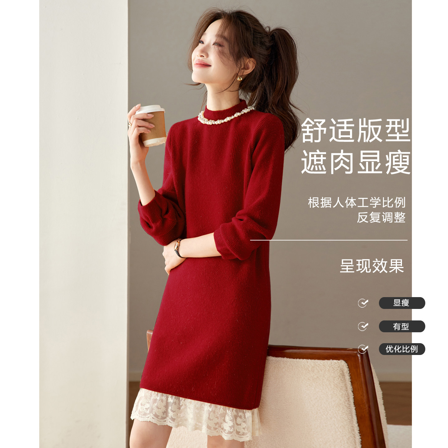 蕾丝拼接针织打底连衣裙女秋冬巨好看中长款加厚配大衣内搭毛衣裙