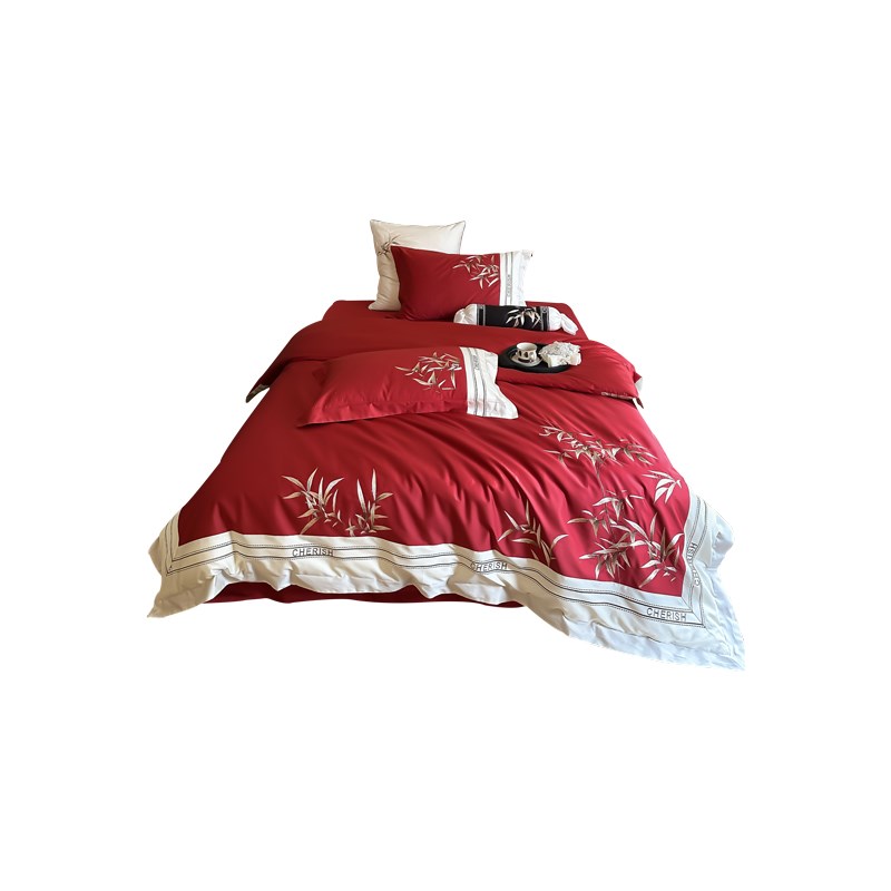 春夏新中式小众婚庆四件套全棉刺绣床上用品红色结婚床单被套纯棉
