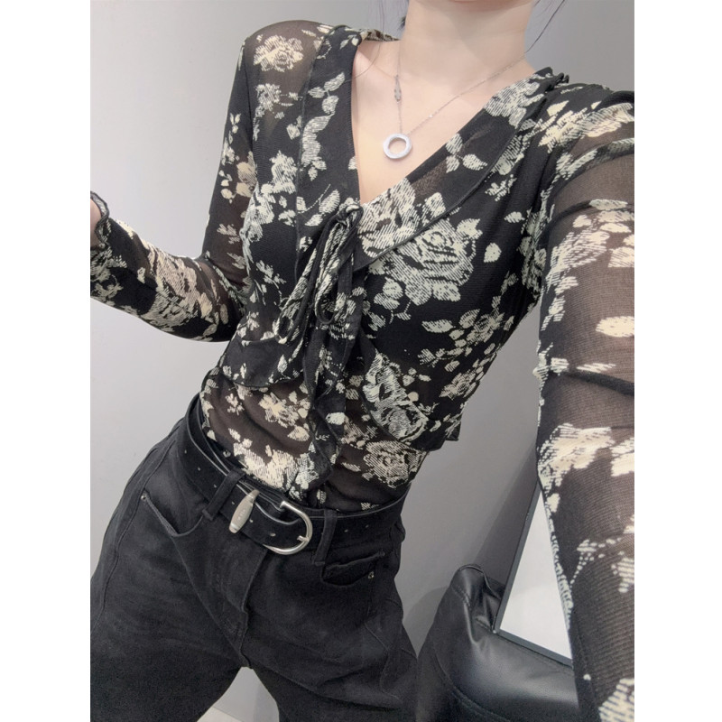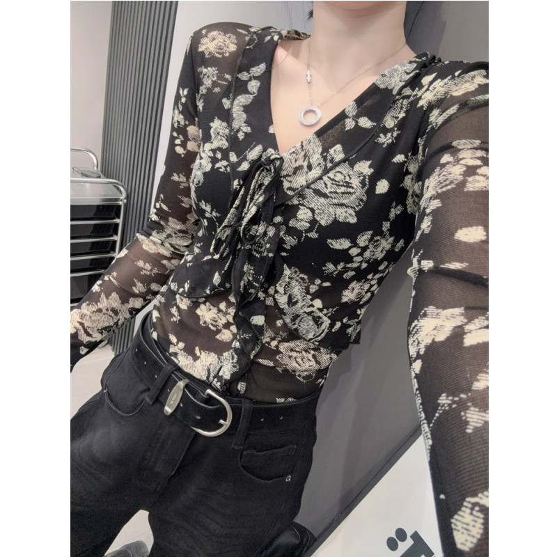 印花V领长袖T恤女时尚气质百搭修身纱衣网纱打底衫荷叶边上衣秋季