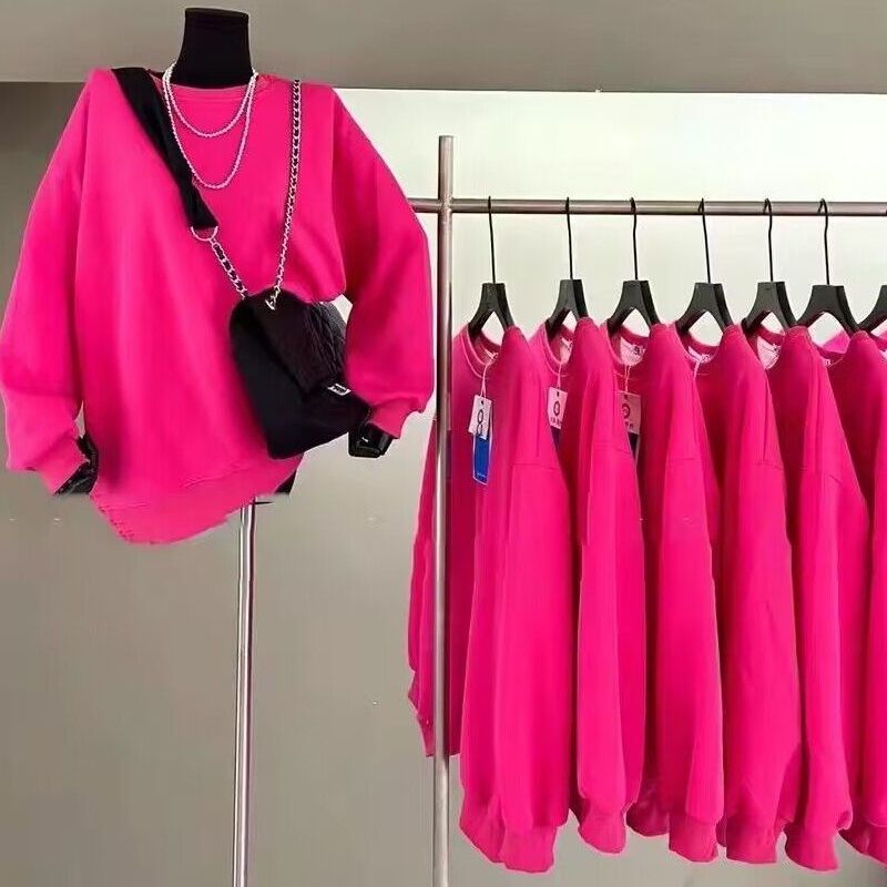 2025秋季洋气减龄银狐绒宽松中长款外套多巴胺玫红纯色圆领卫衣女
