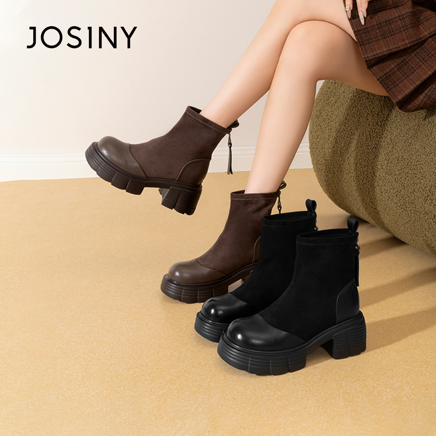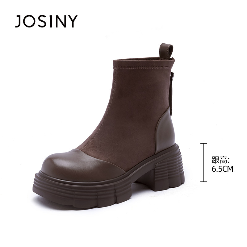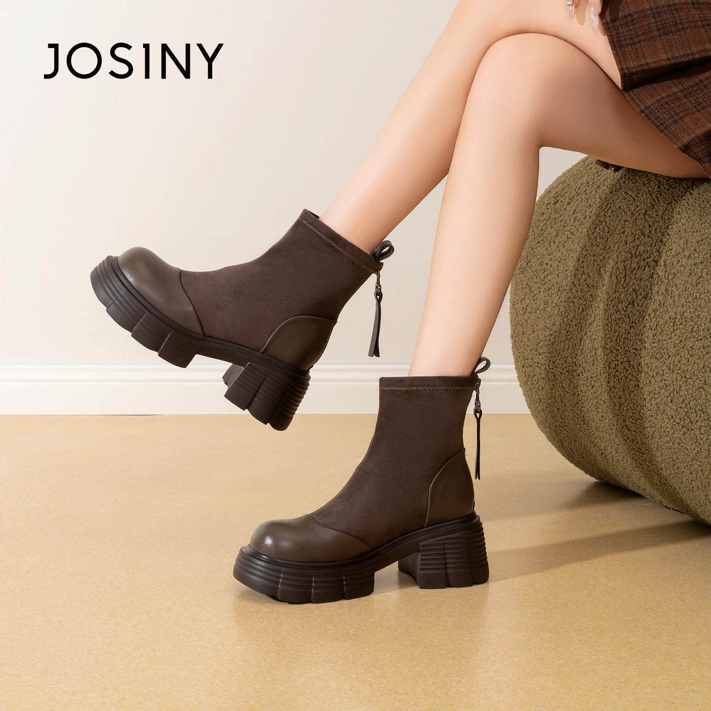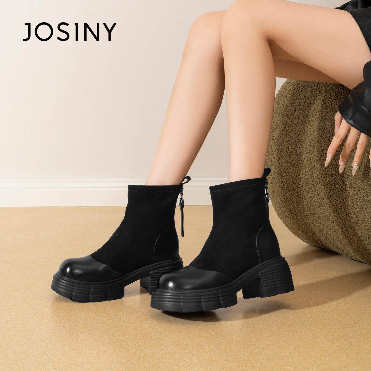 卓诗尼冬季25粗跟短靴女网红金属链尖头高跟时装马丁靴女春秋裸靴