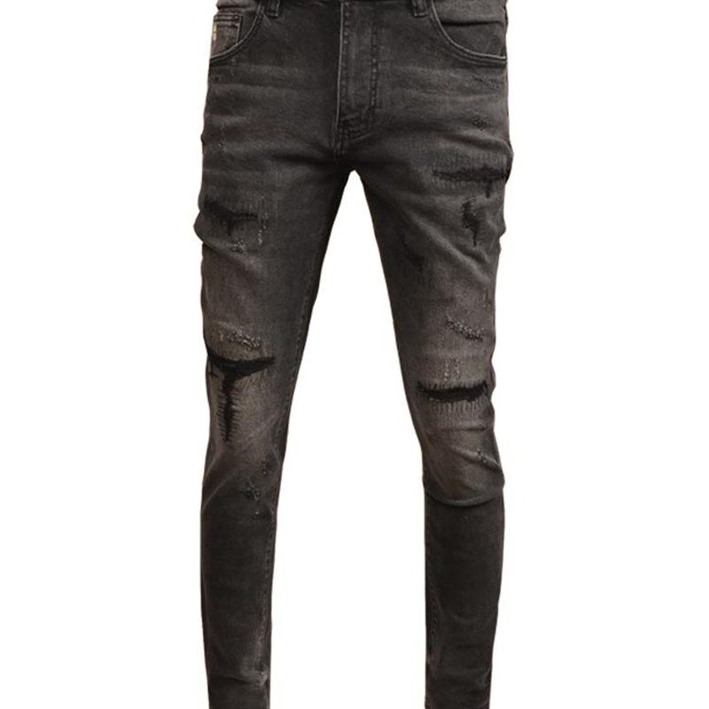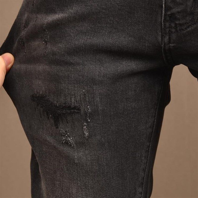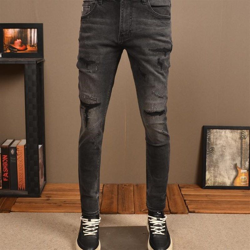 复古黑色破洞牛仔裤男春秋款潮牌弹力修身韩版休闲补丁紧身小脚裤