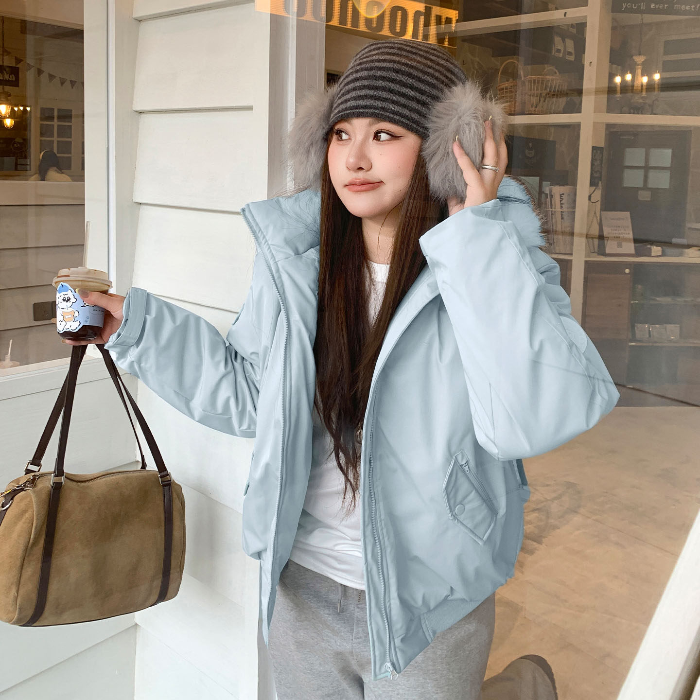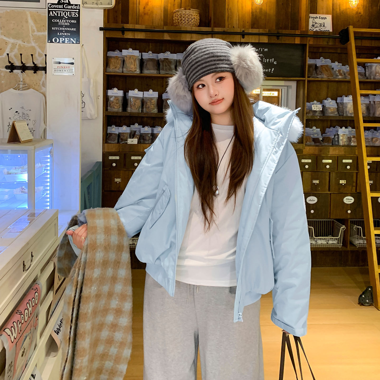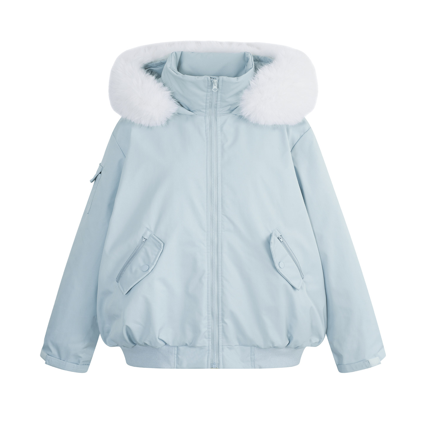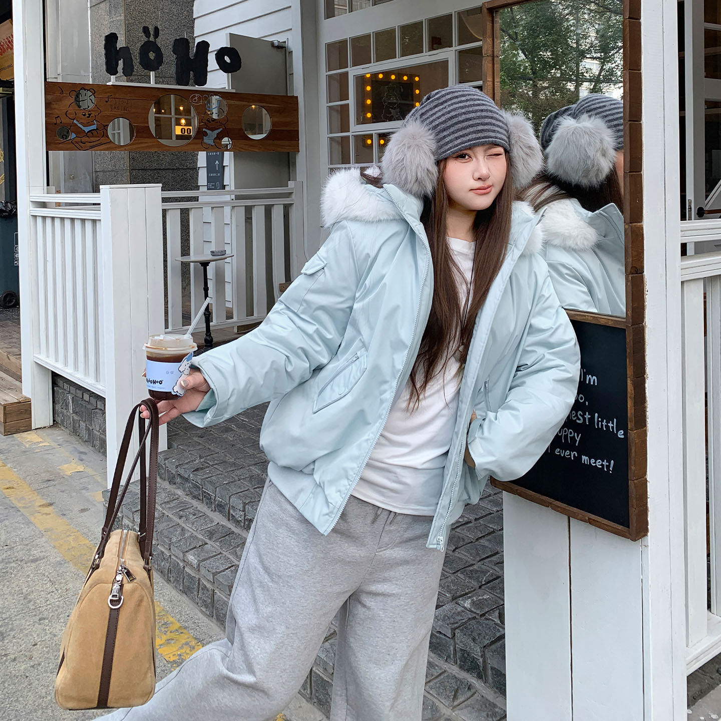 YUZI鱼子甜酷短款派克服外套细闪大毛领蓝色宽松加厚棉服大码女装