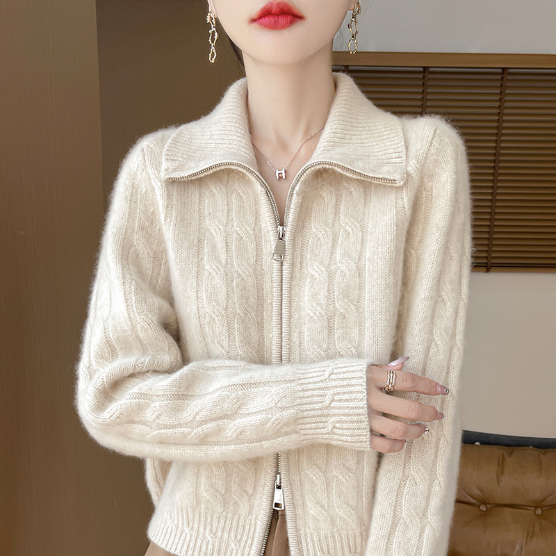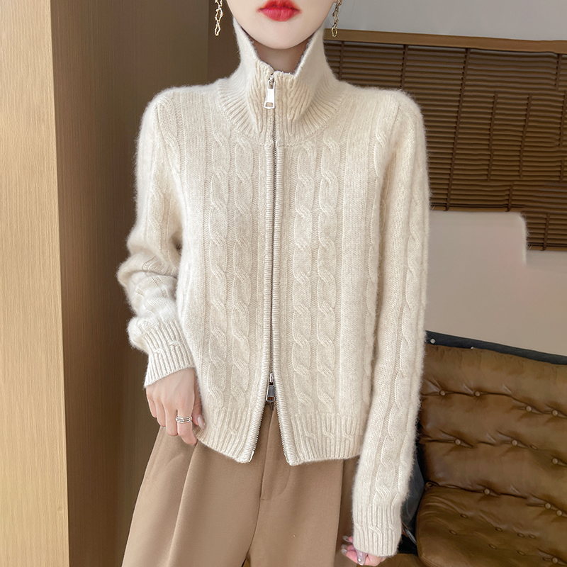 鄂尔多斯市重磅开衫女短款羊绒衫双股加厚针织衫毛衣拉链外套翻领