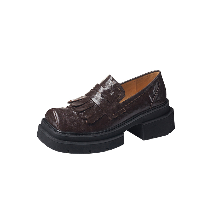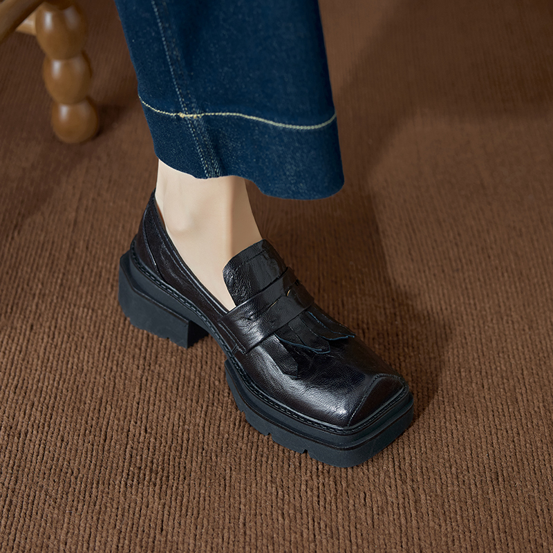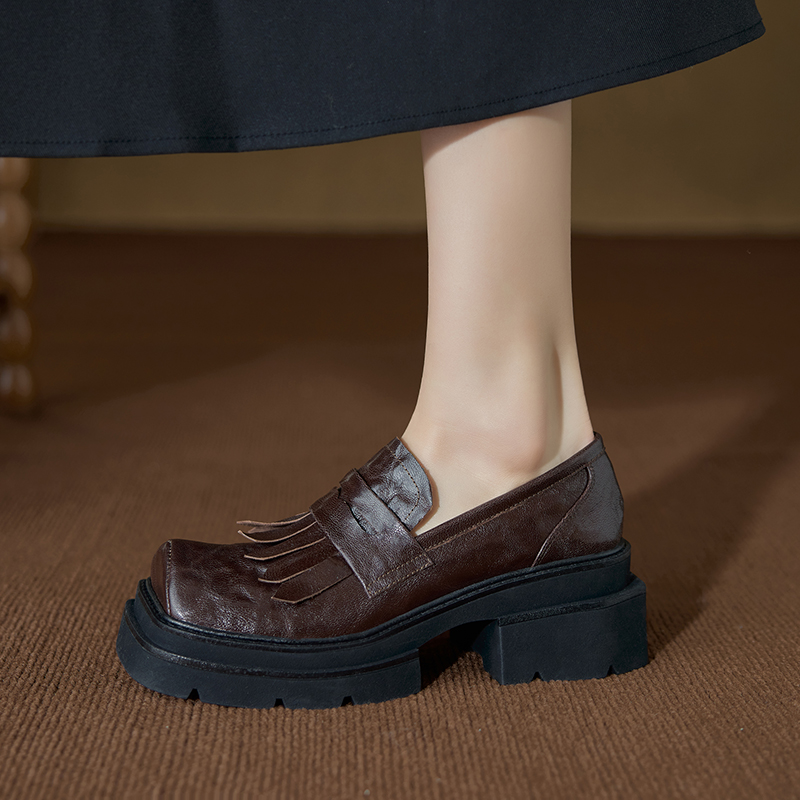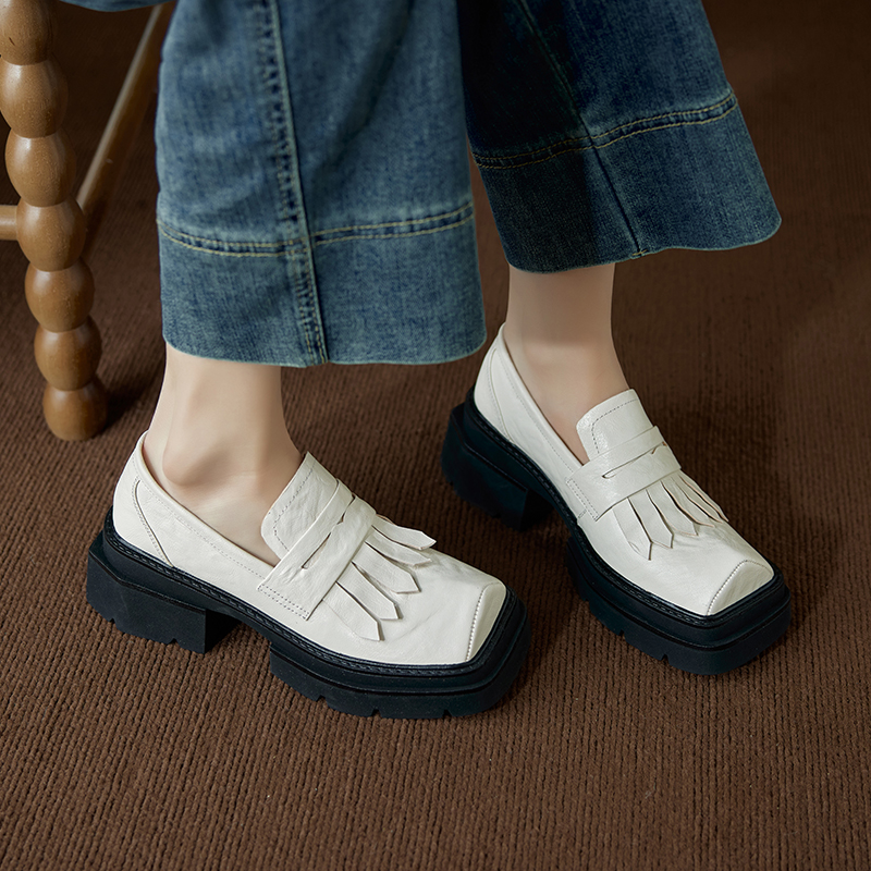 真皮方头乐福鞋女2025新款春季厚底百搭单鞋高跟英伦风流苏小皮鞋