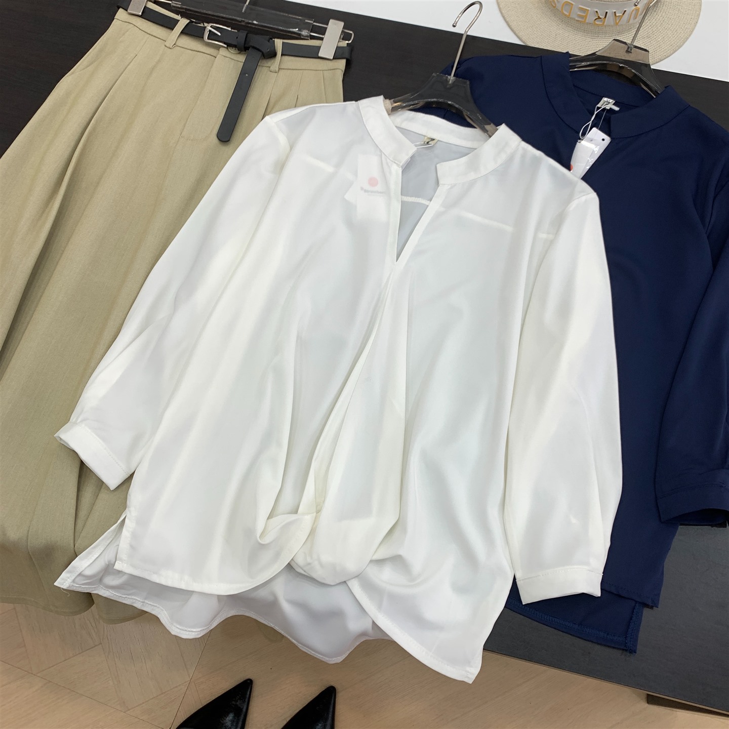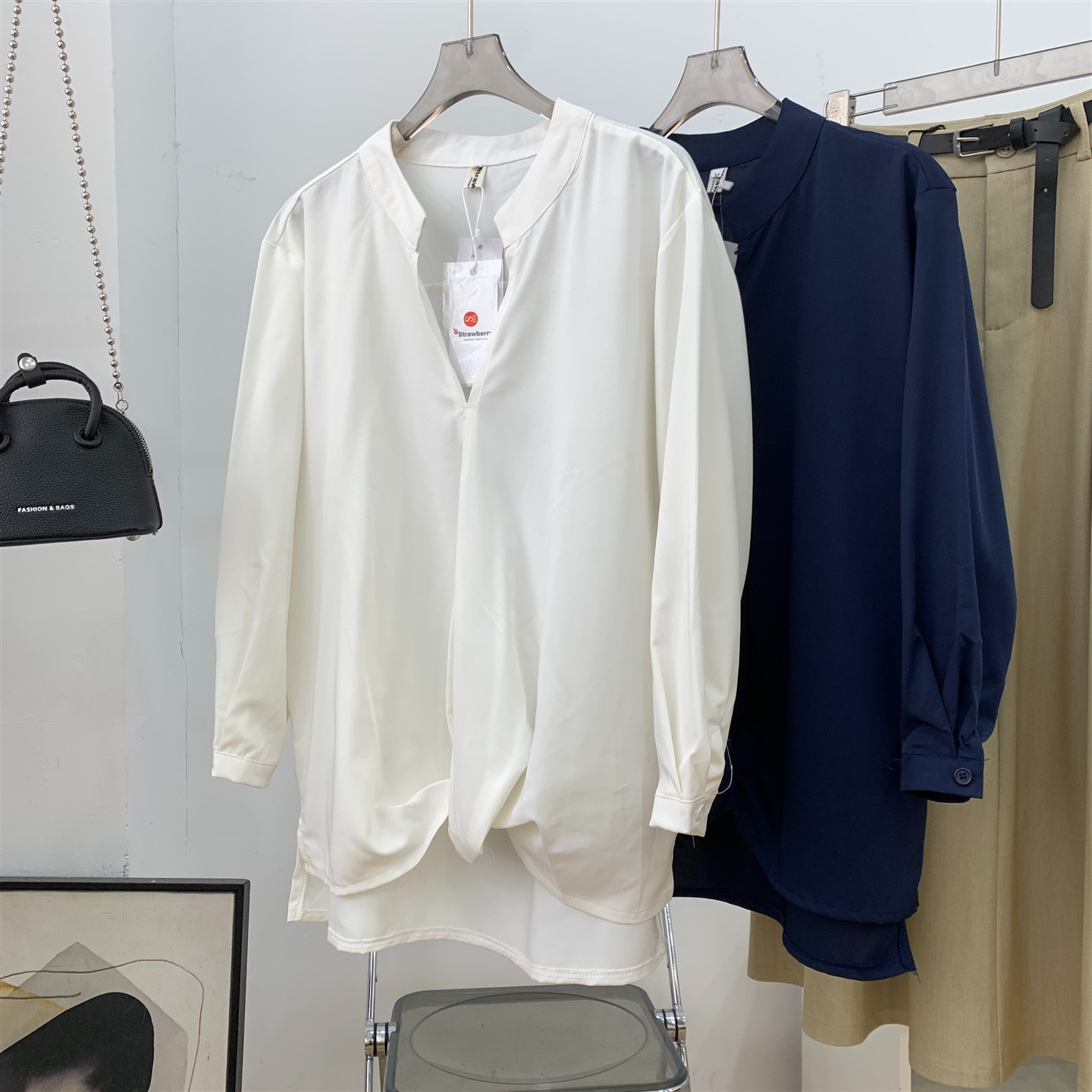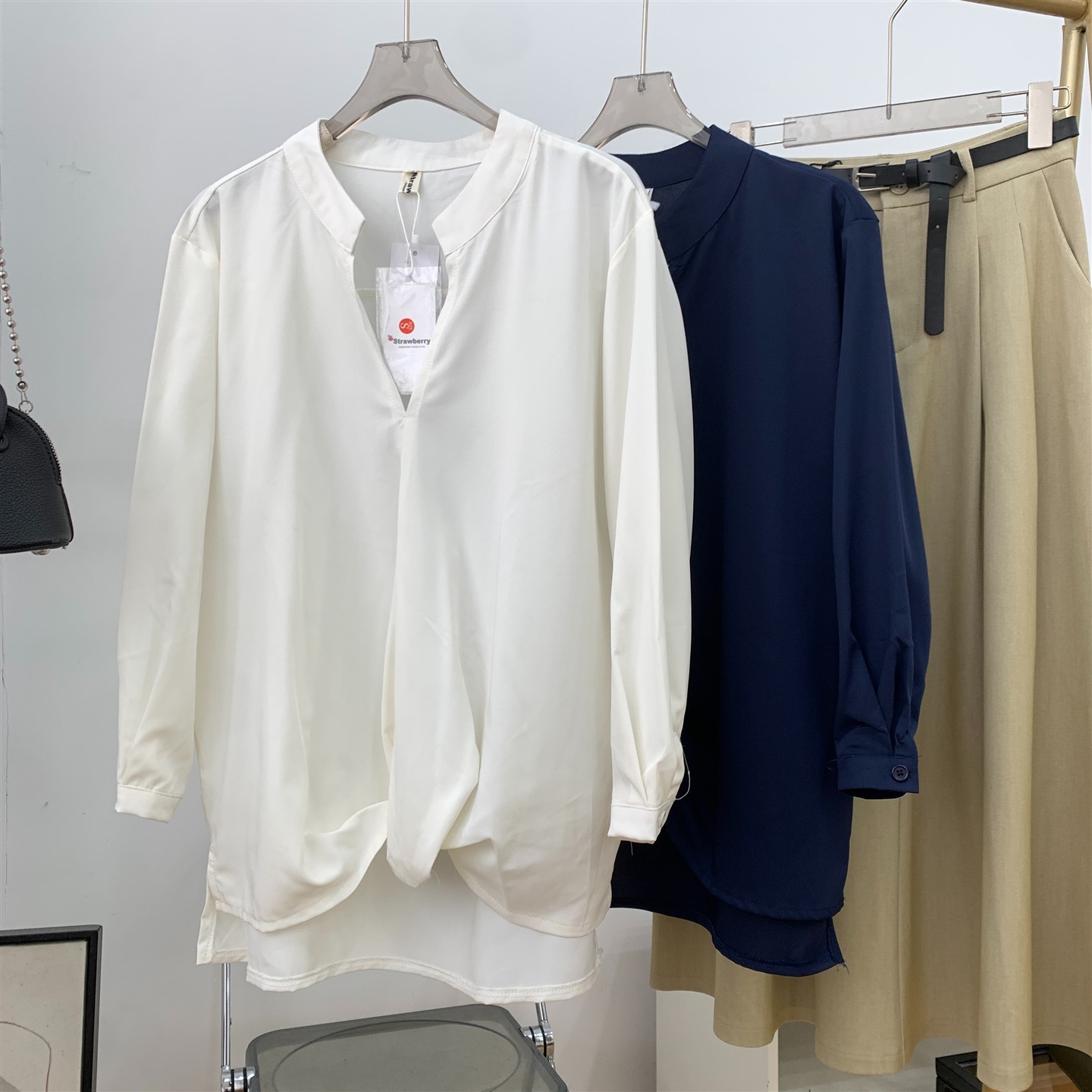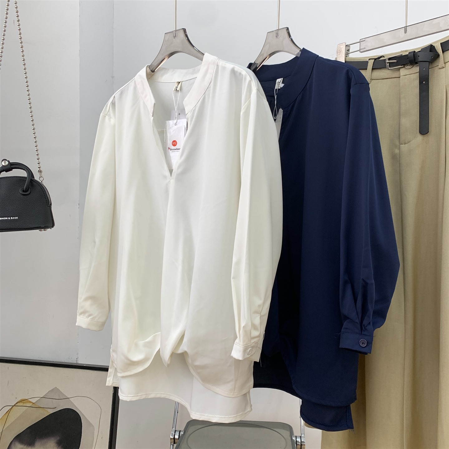 衬衫V领纯色宽松长袖上衣休闲百搭小众设计秋季新款J#5