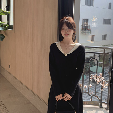一三良品小个子 手工钩花v领收腰修身黑色针织连衣裙长裙内搭裙