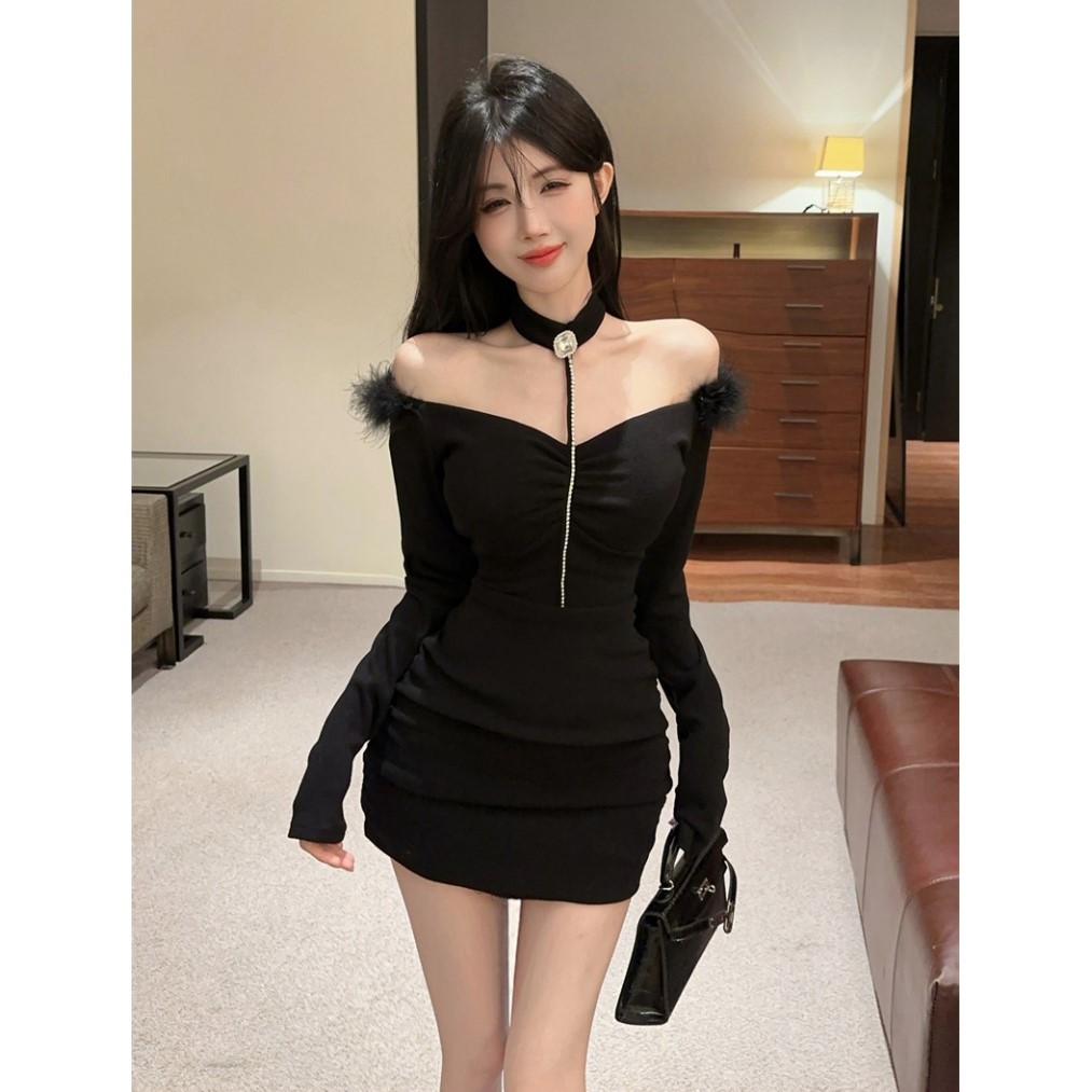 一字肩水钻挂脖拼接毛毛连衣裙女春季新款修身显瘦打底包臀短裙子