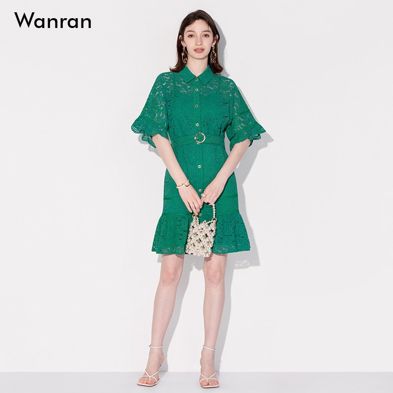 2025夏装新款时尚气质方领收腰荷叶摆短袖衬衫式蕾丝连衣裙