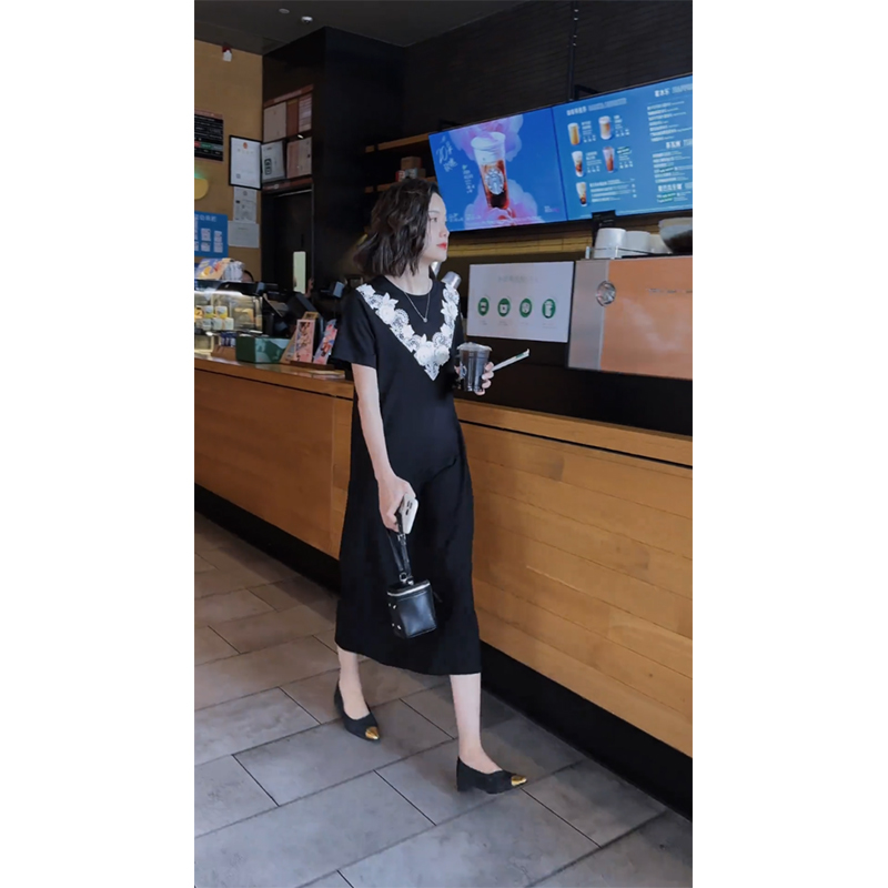 柒院家微胖大码女装设计感拼接花边领连衣裙2025夏宽松显瘦中长裙