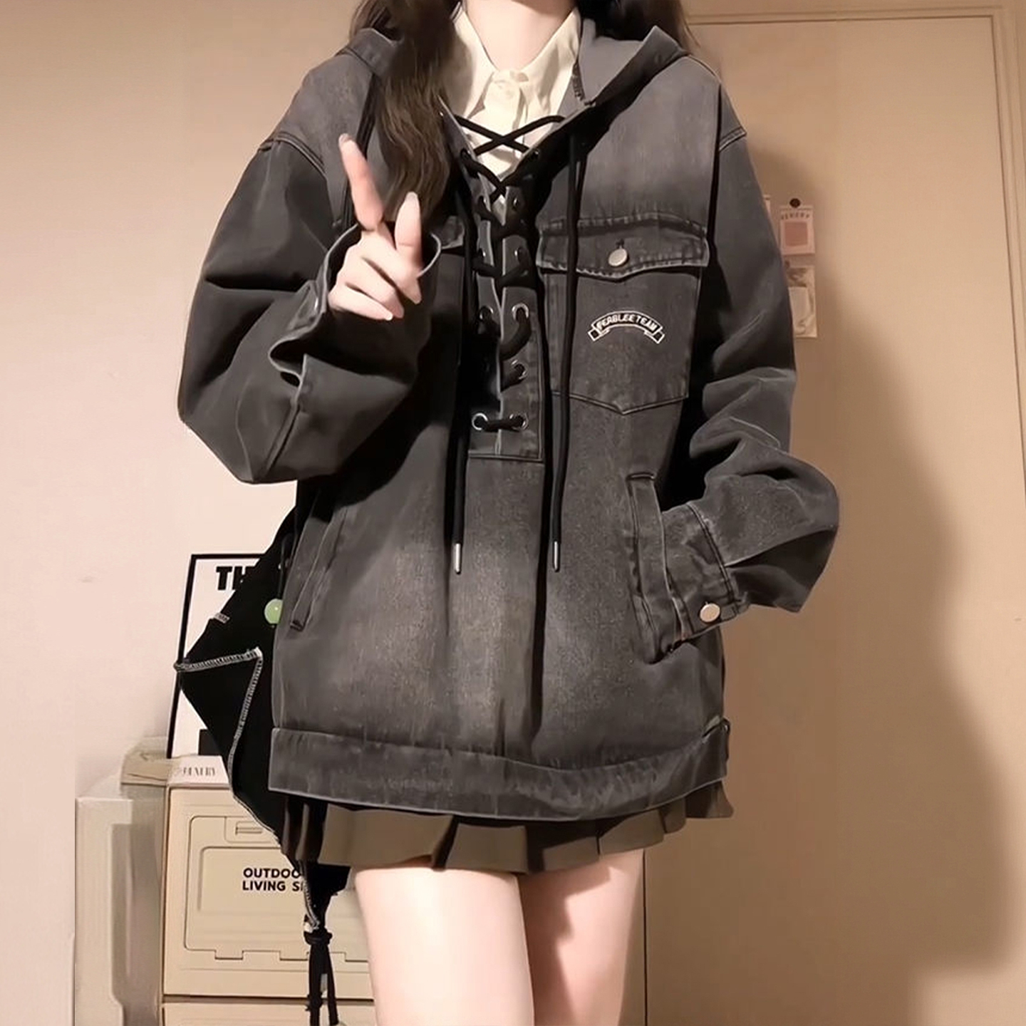 300斤特大码美式复古设计感牛仔外套女秋季宽松做旧水洗连帽卫衣