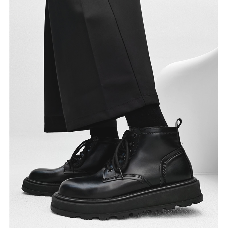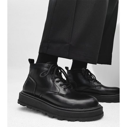 英伦风暗黑色马丁靴男ins韩版真皮中帮厚底机车短靴高帮工装皮鞋