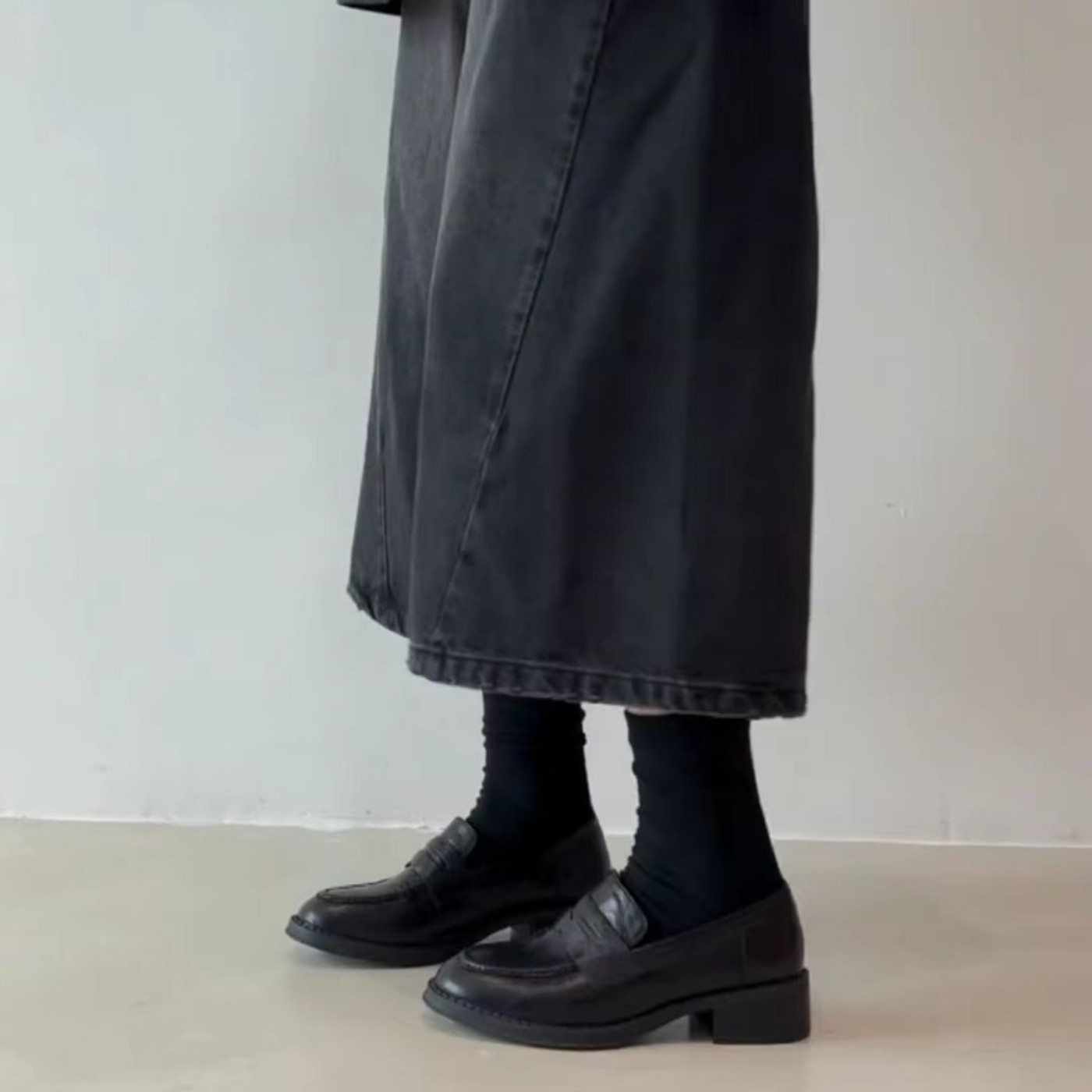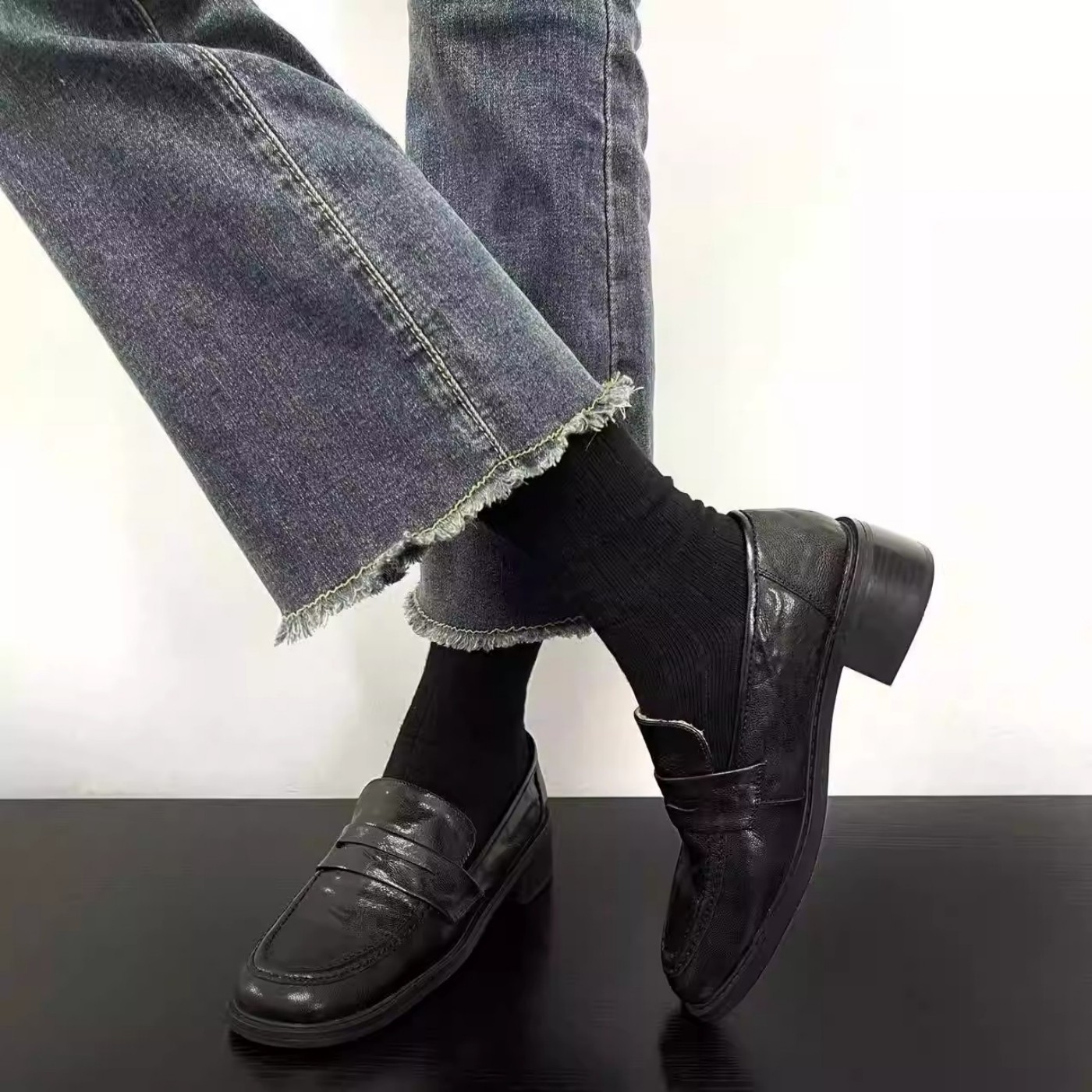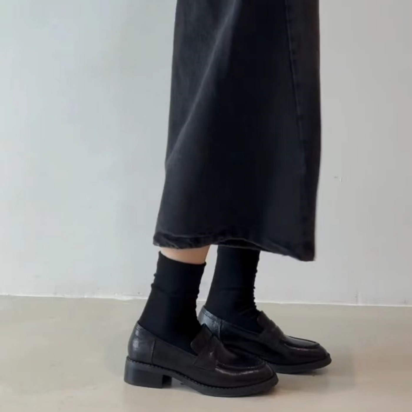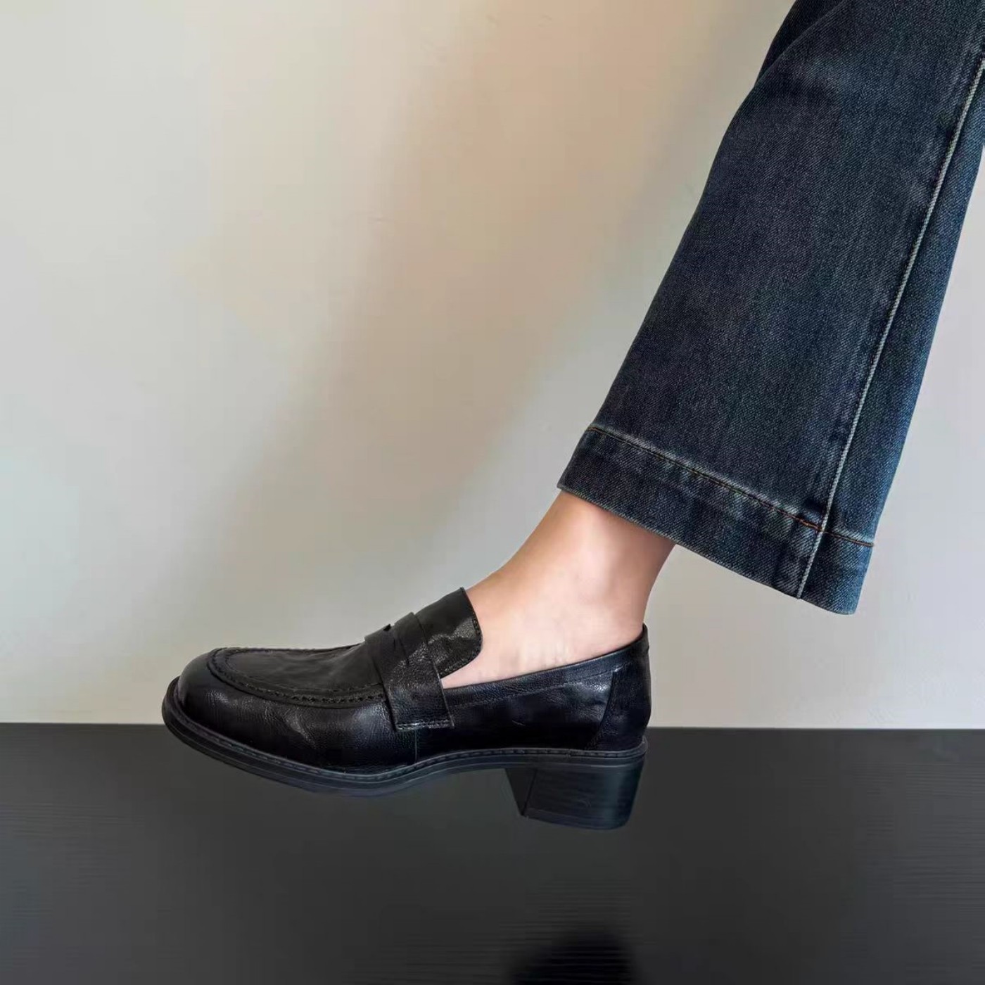 百搭英伦风中跟一脚蹬乐福鞋复古新款小皮鞋粗跟圆头真皮女鞋单鞋