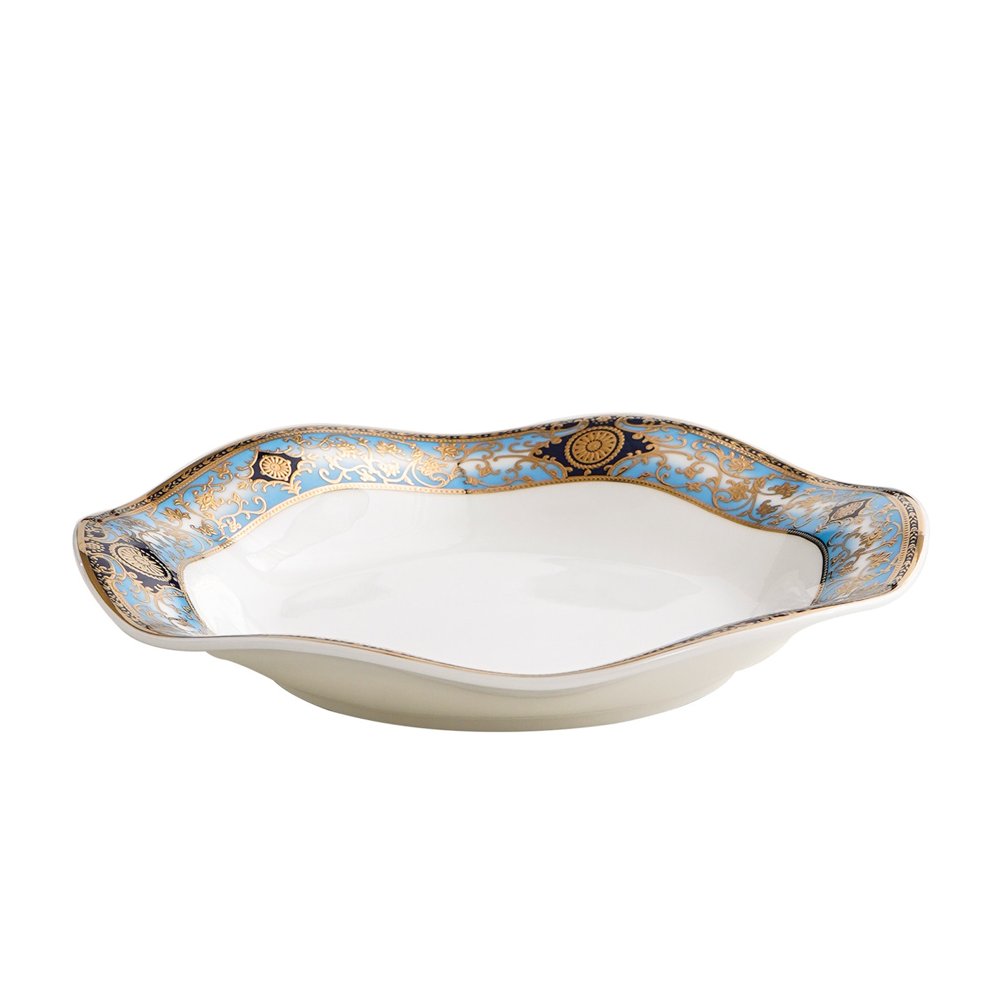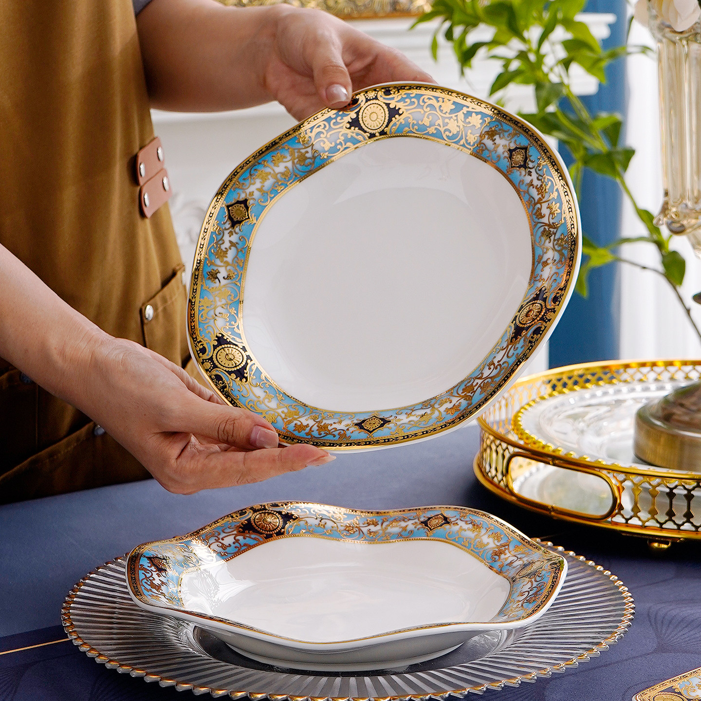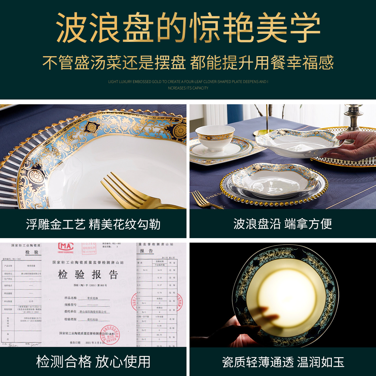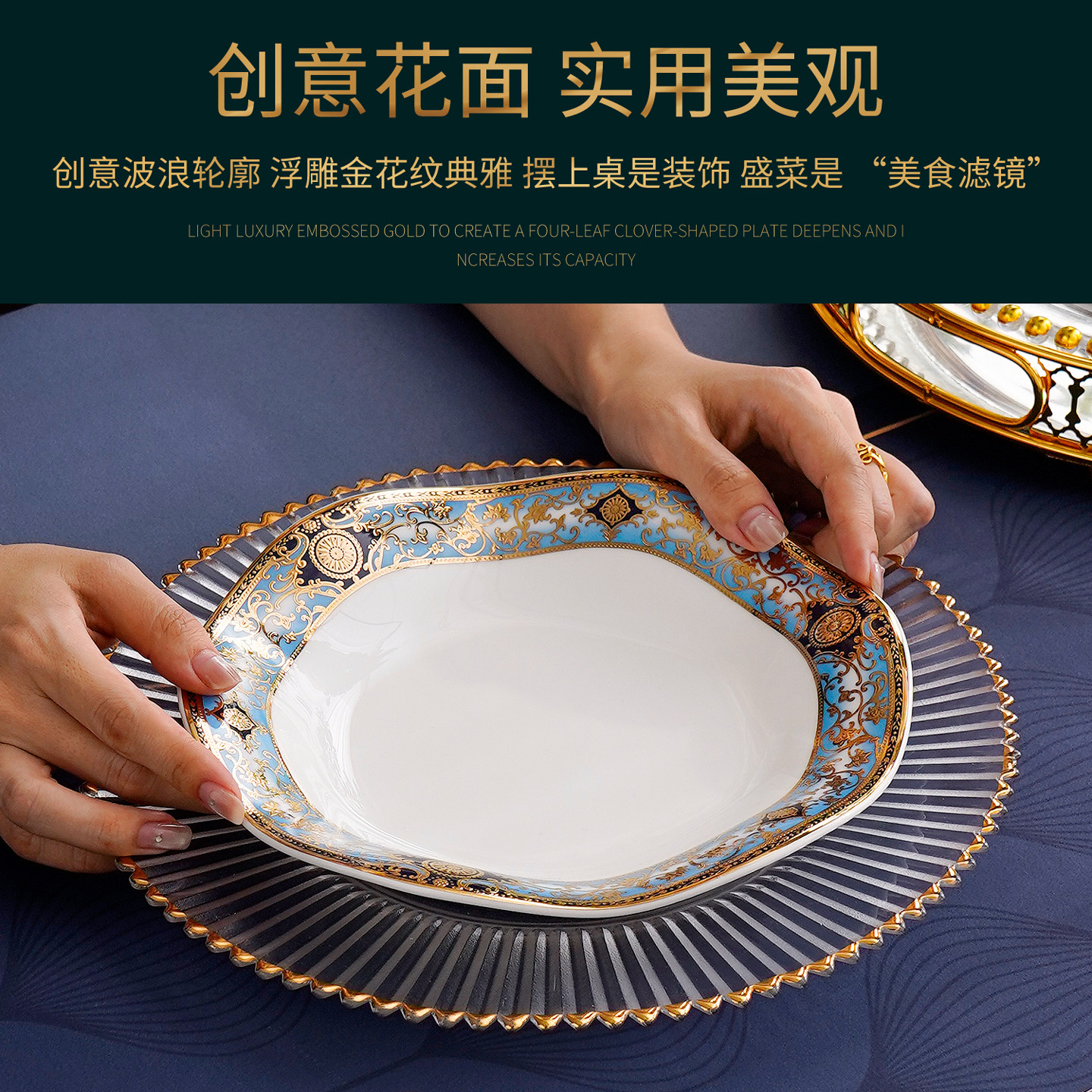 欧式浮雕金8英寸骨瓷波浪盘家用浅菜盘汤盘创意甜品盘果盘荷叶盘