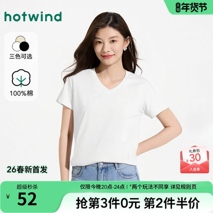 热风女士白色v领显瘦短袖T恤上衣2026年春季新款黑色基本V领短袖T