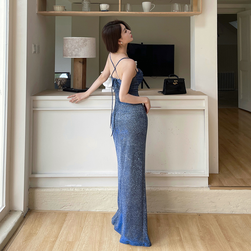 2025高级感开叉礼服裙女蓝色闪闪轻奢气质连衣裙秋季走秀宴会长裙