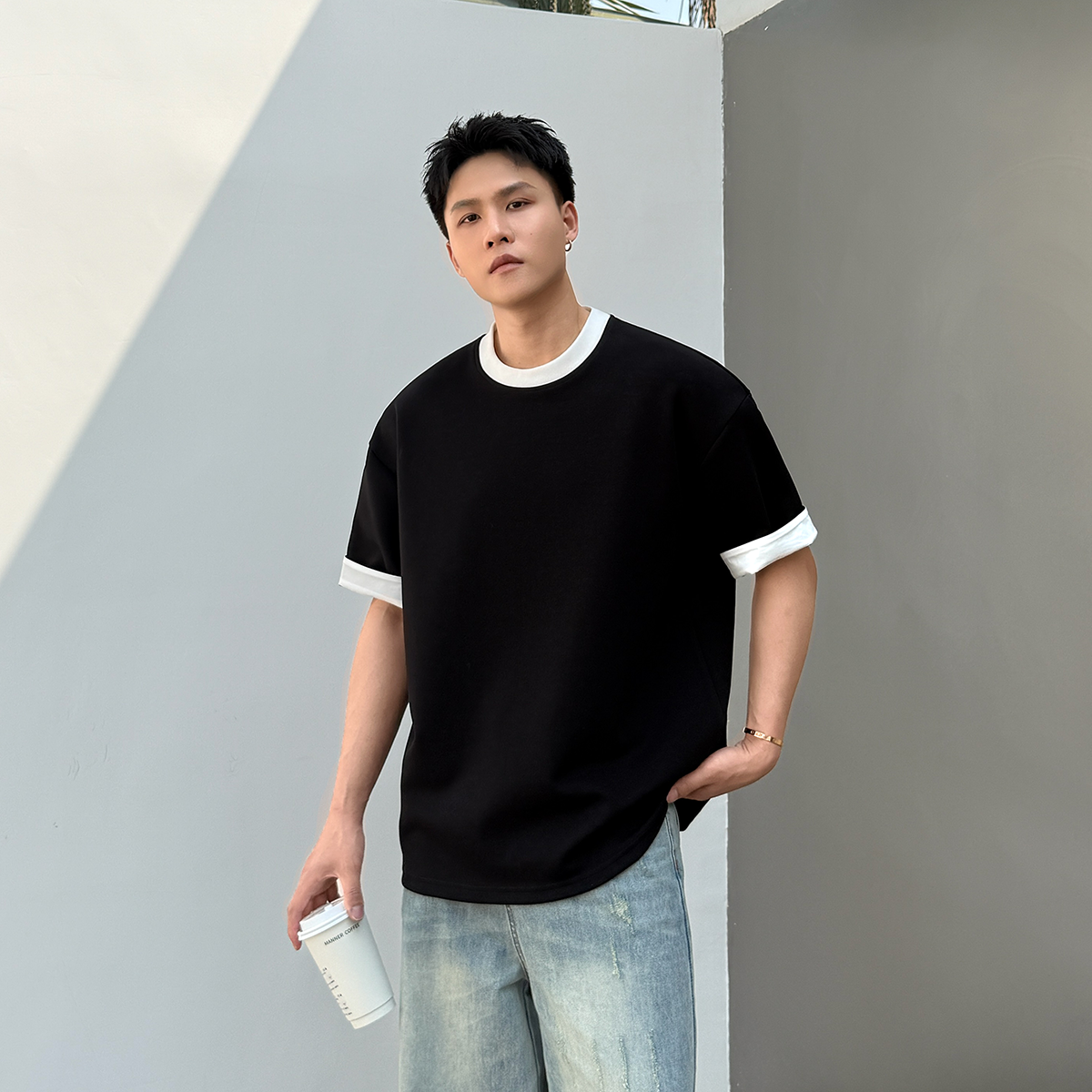 【宽边假两件】重磅320g太空棉短袖男士2025夏季新款宽松t恤高级T