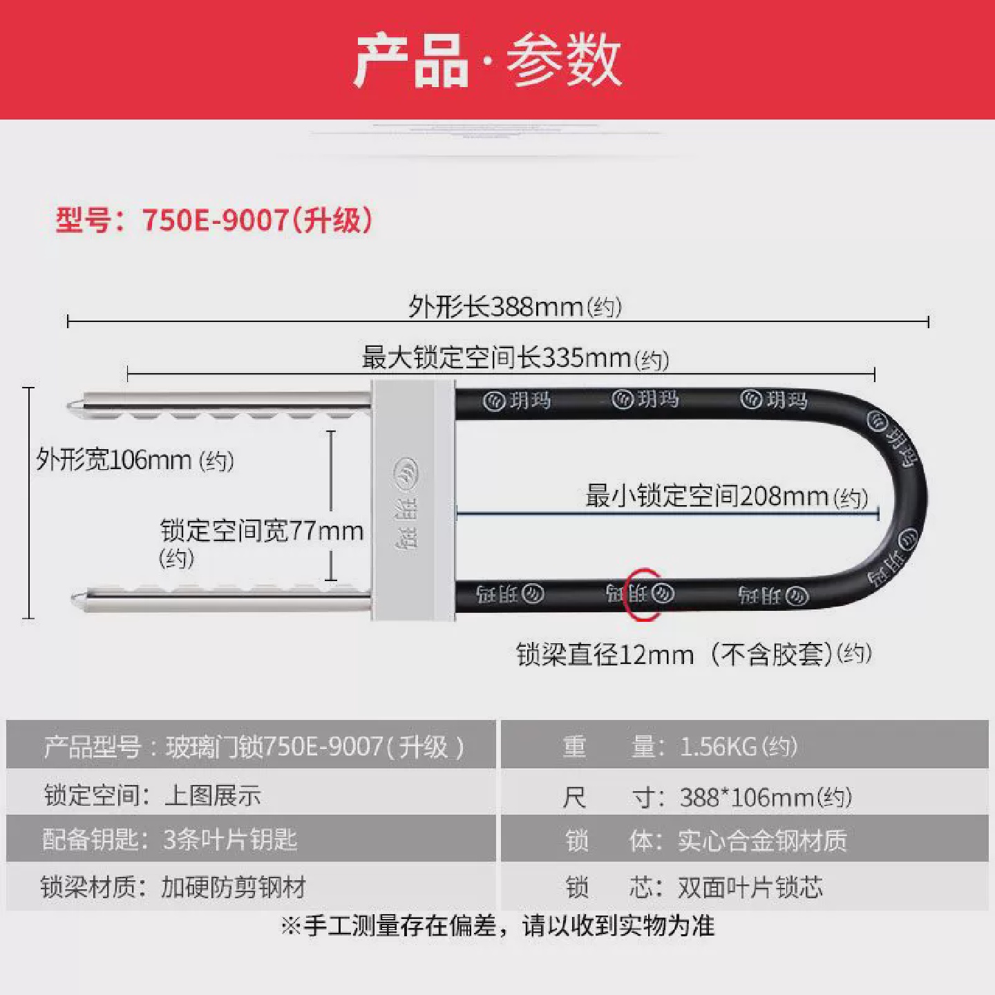 玥玛钢化玻璃门锁U型锁具双开??关带有框免钻孔拉门店铺商铺铝合