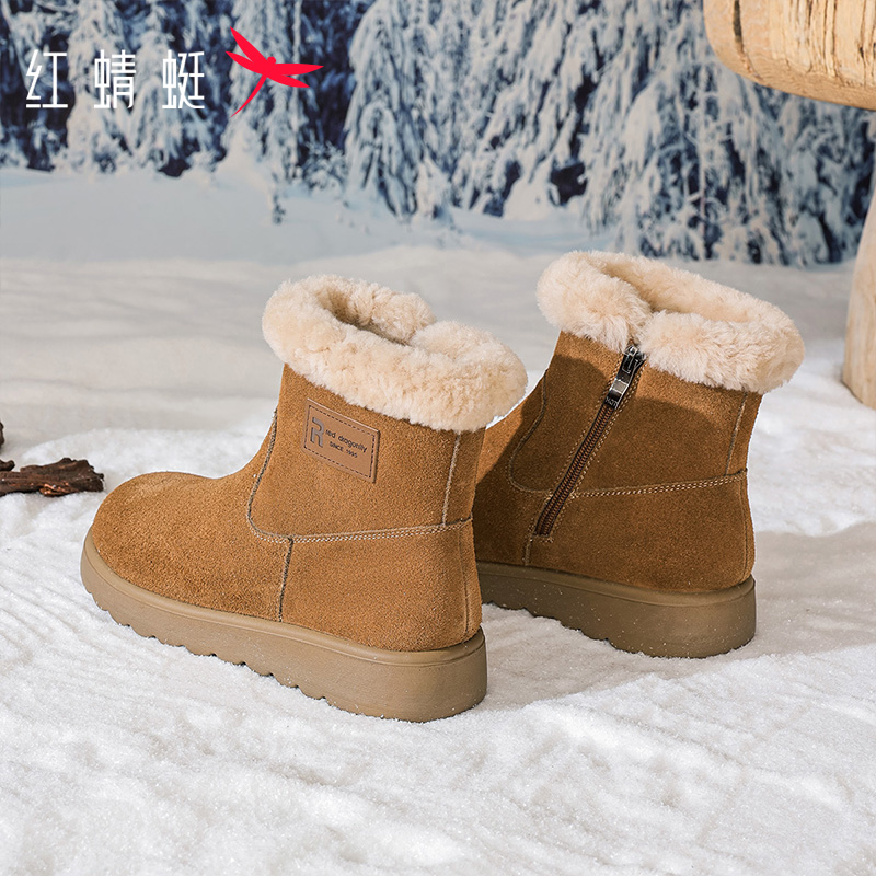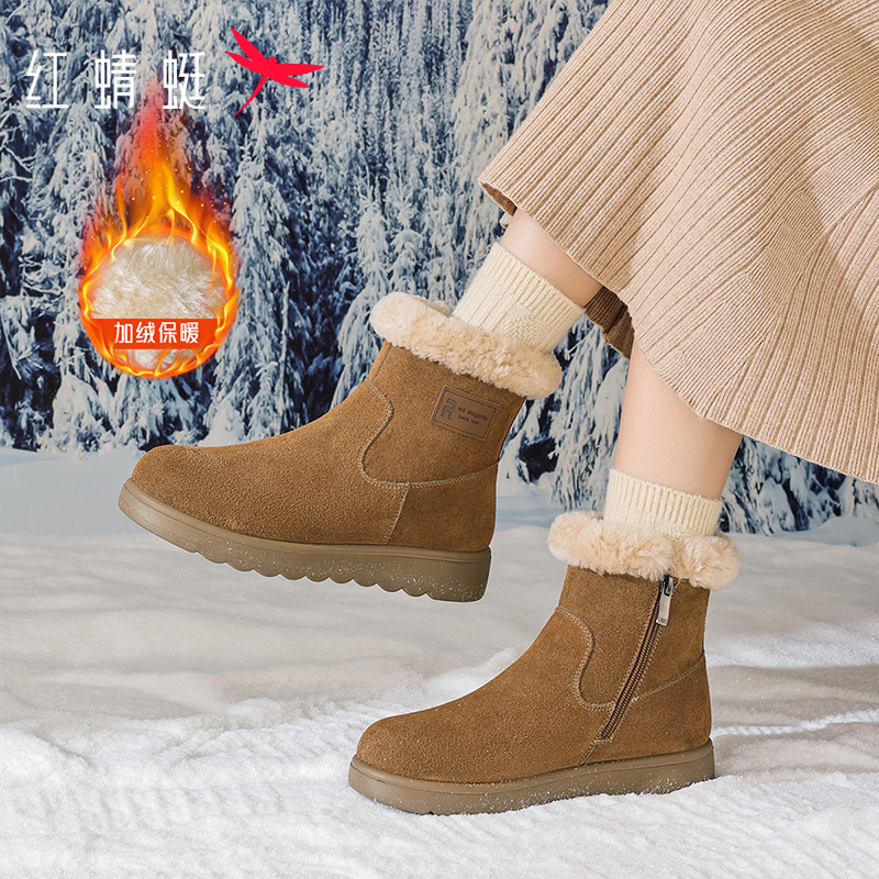红蜻蜓真皮羊毛加绒加厚雪地靴保暖棉鞋冬季女鞋新款厚底棉靴子女