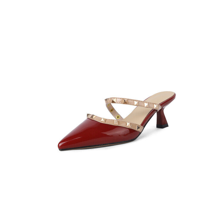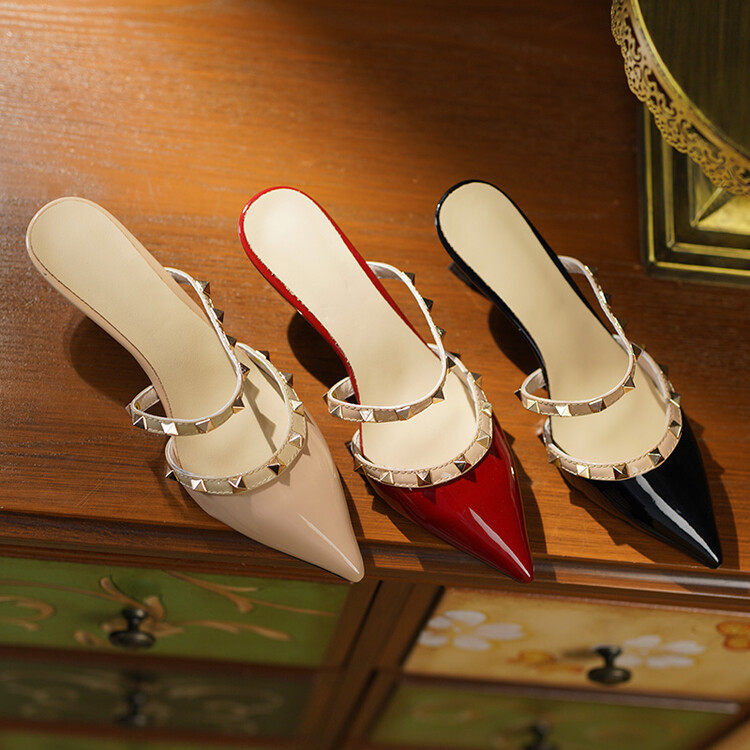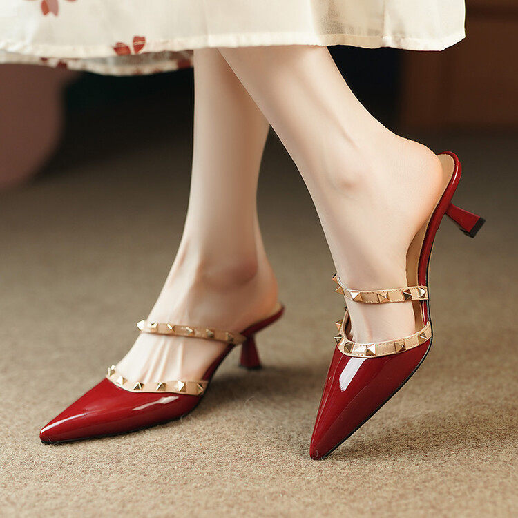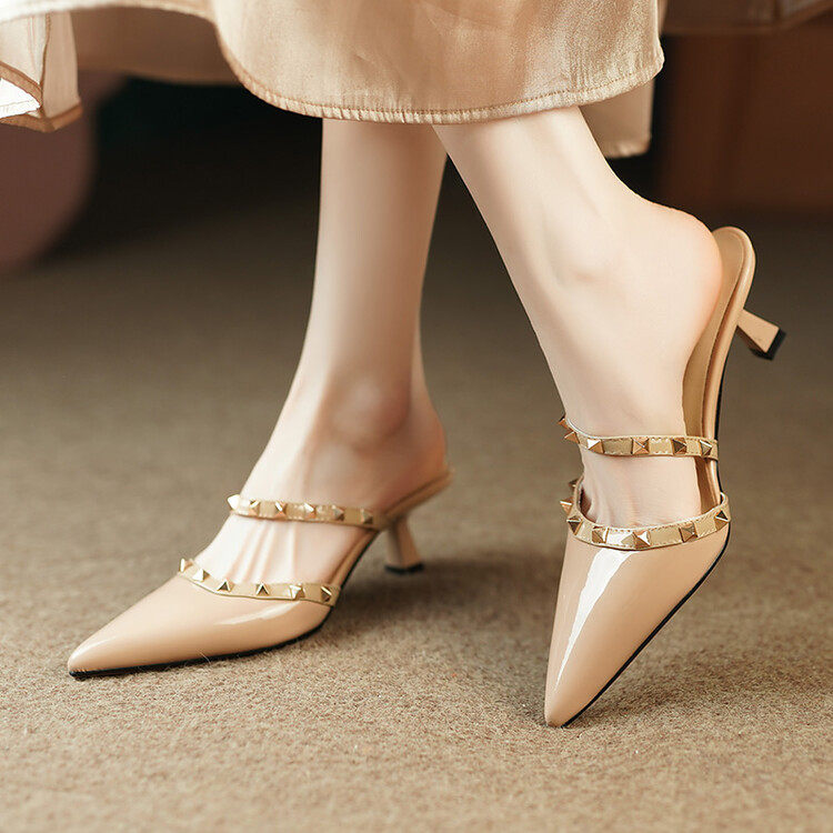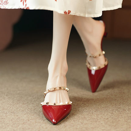 2024年真皮包头半拖鞋女夏季外穿百搭尖头凉鞋中跟细跟铆钉高跟鞋