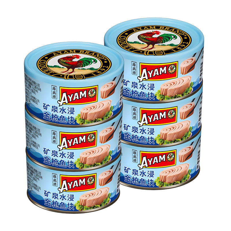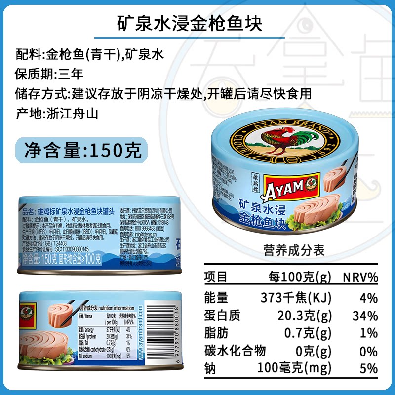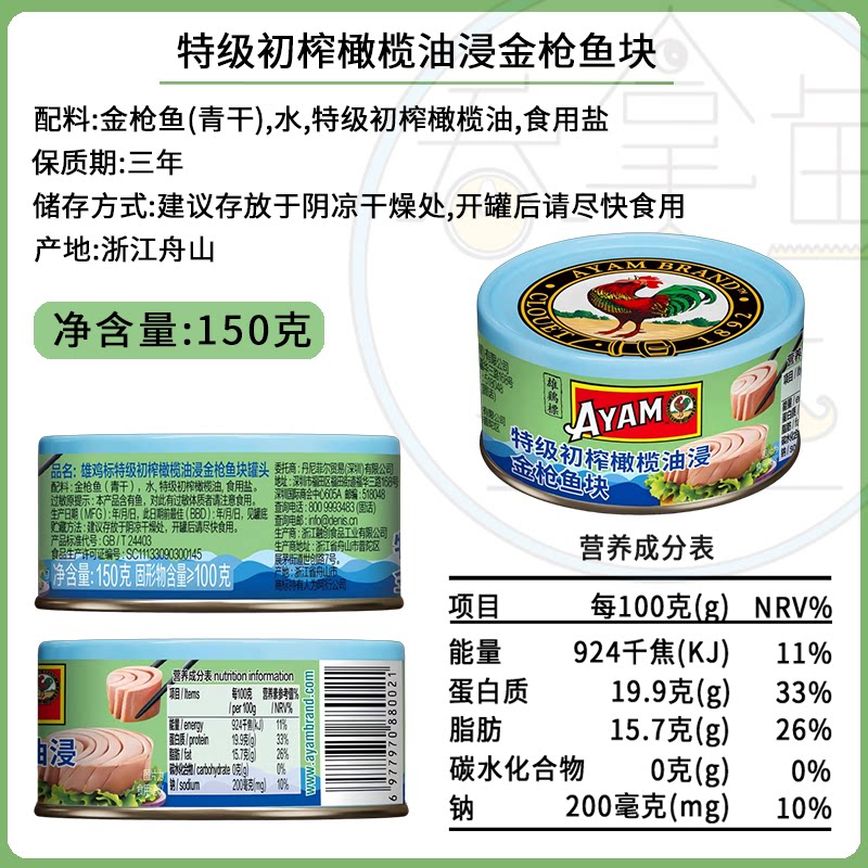 雄鸡标150g大罐吞拿鱼金枪鱼罐头即食橄榄油浸水浸配盖叉六罐装