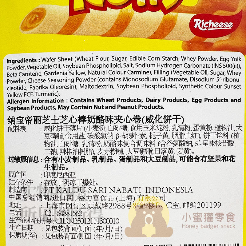 印尼进口纳宝帝丽芝士芝心棒奶酪味夹心卷威化饼干180g零食品