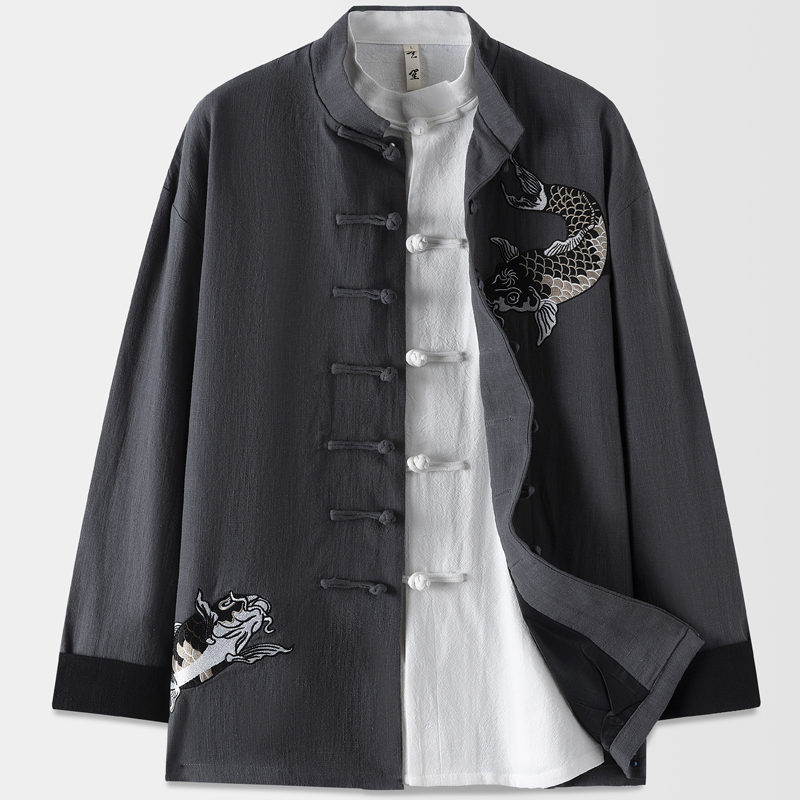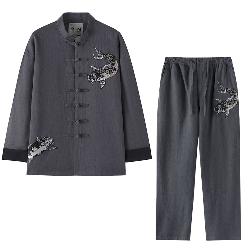 中国风男装秋季锦鲤刺绣唐装男套装手工盘扣国潮男士长袖外套男