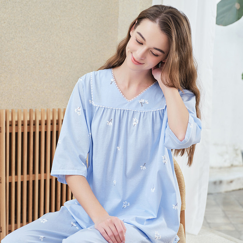 美标睡衣夏季女士中袖长裤套装100%纯棉宽松家居服套装可外穿休闲