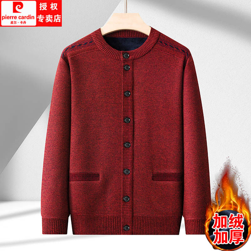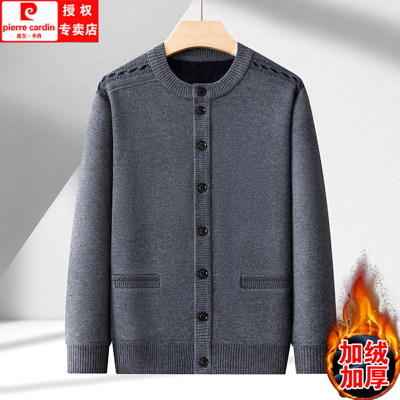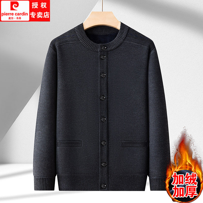 皮尔卡丹羊毛衫男开衫秋冬款中老年人爸爸装加绒加厚针织毛衣外套