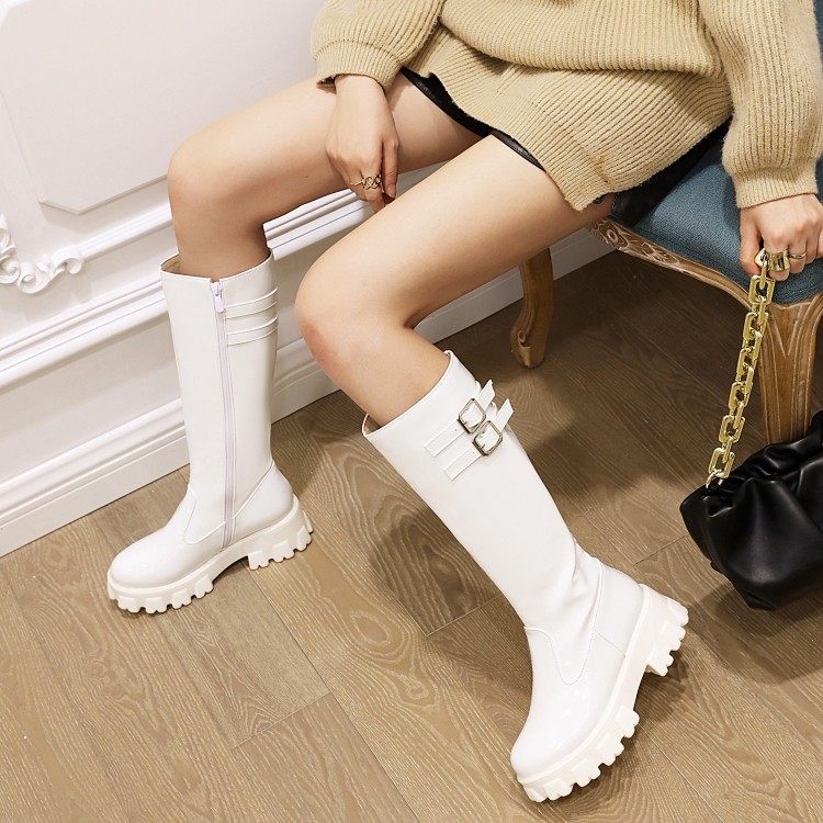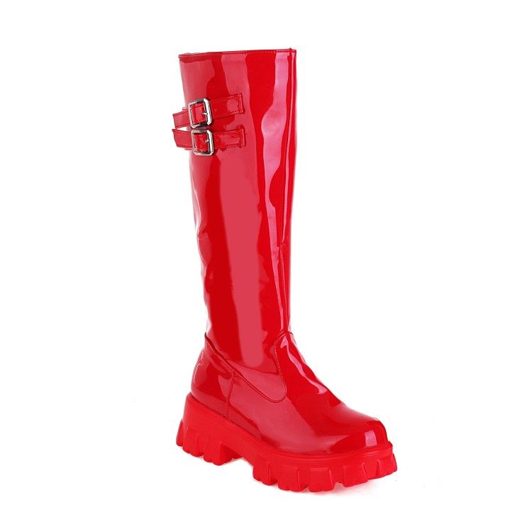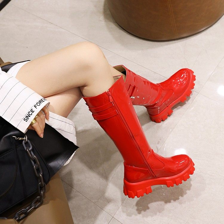 漆皮时装靴女厚底松糕鞋交叉系带高筒靴复古风圆头中跟女靴大码