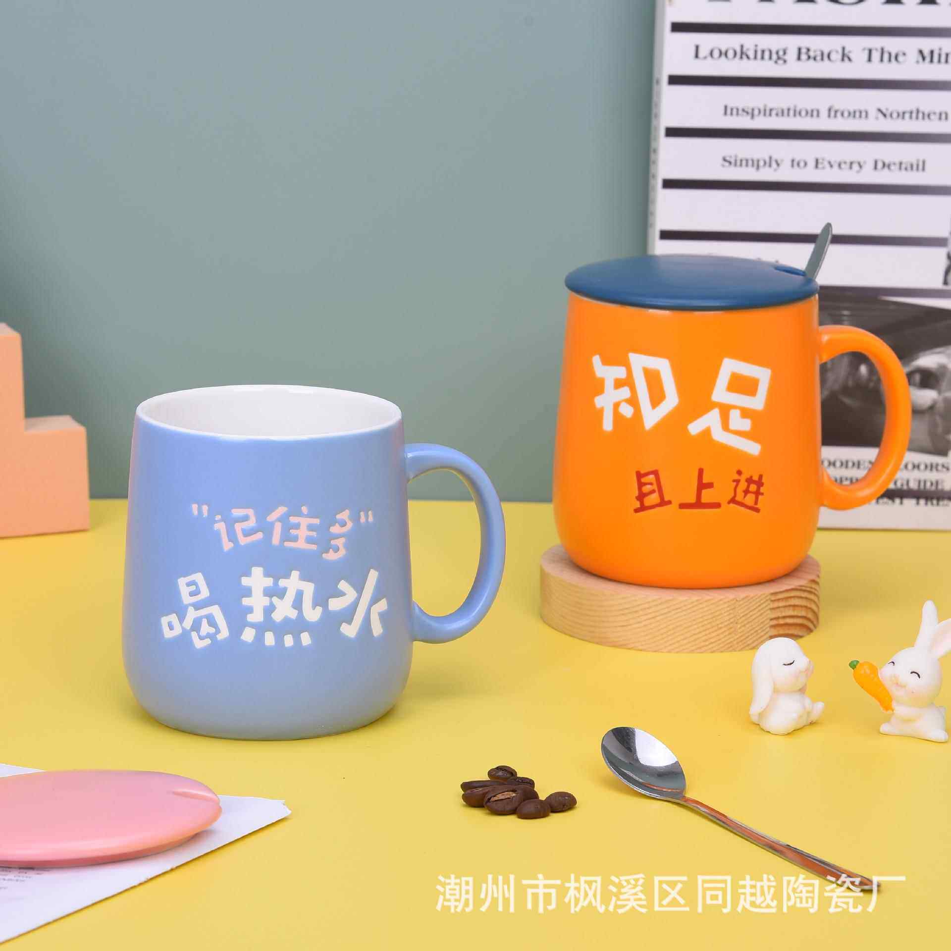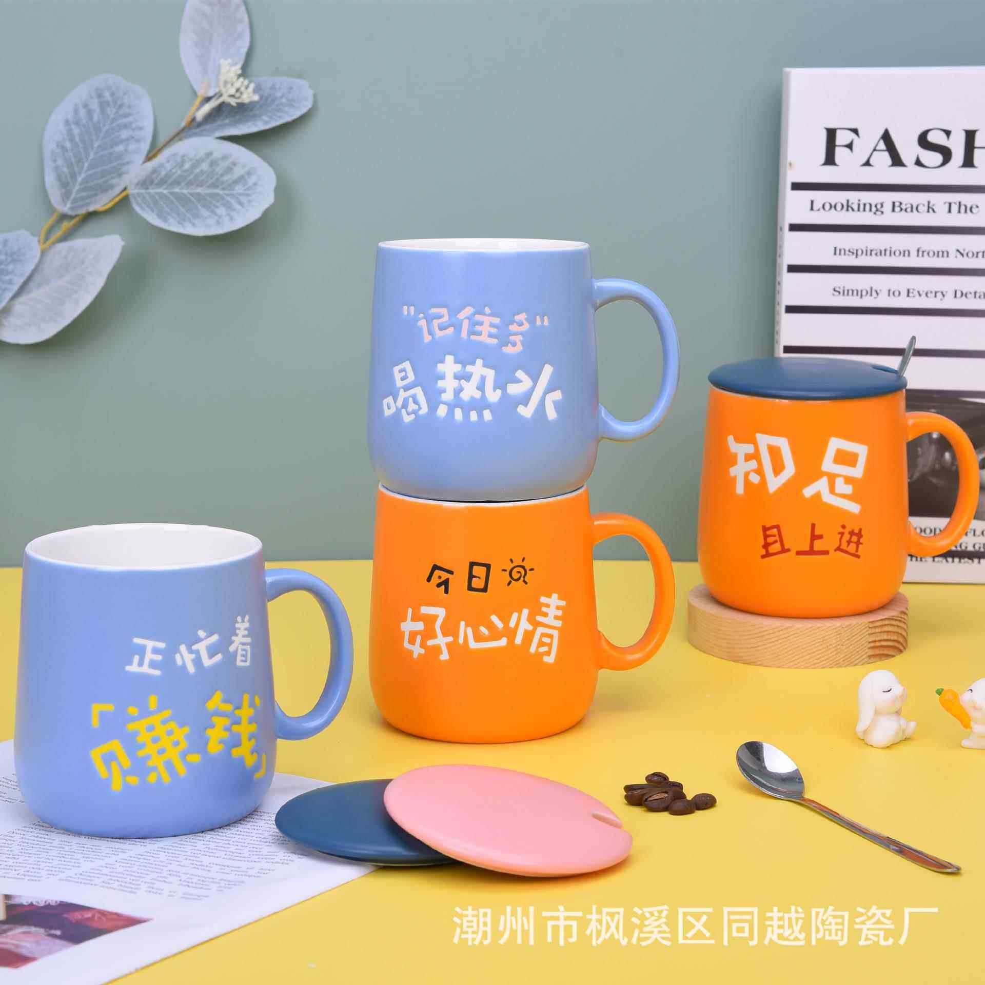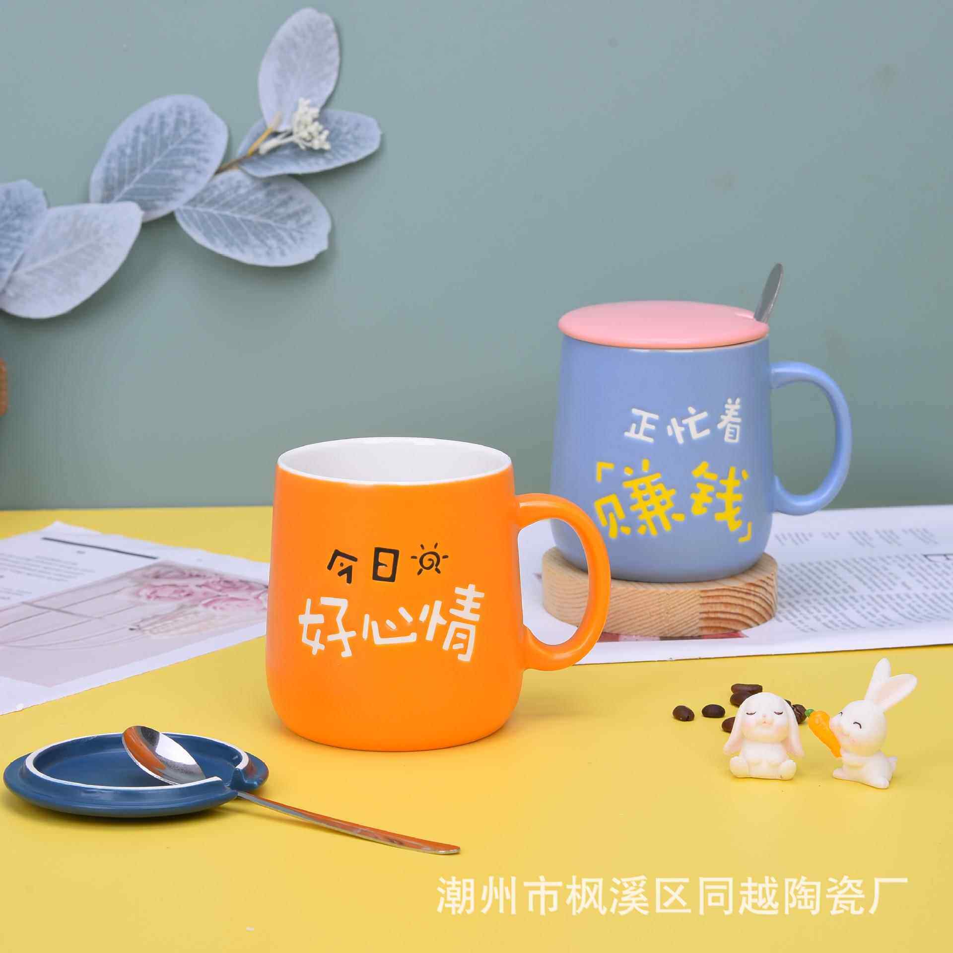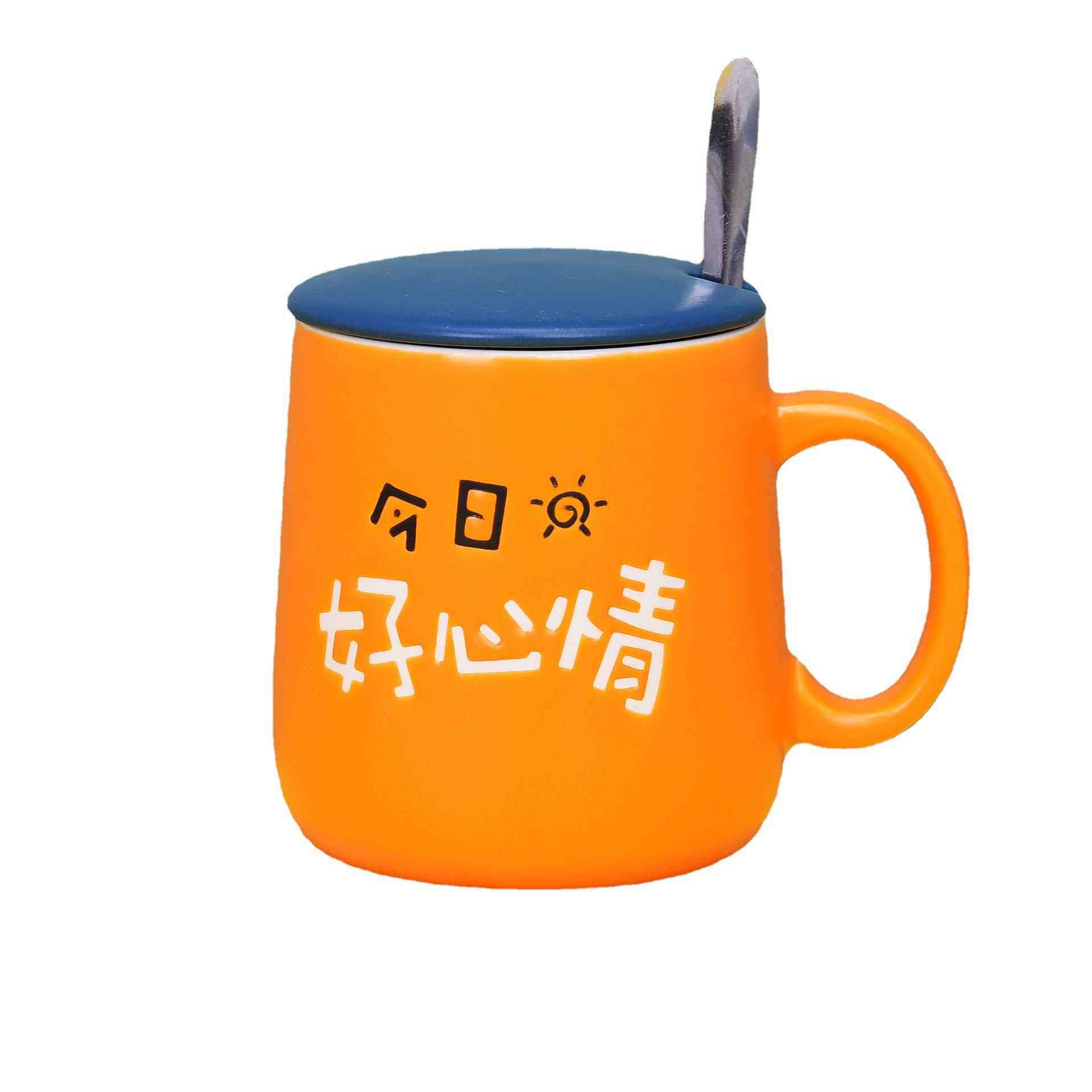 马克杯陶瓷杯大容量水杯家用杯子带盖橙色办公杯创意情侣对杯