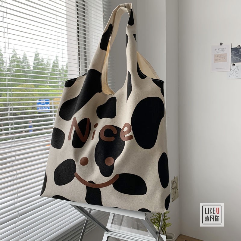 2025原创Nice奶牛设计慵懒风单肩包书包文艺简约卡通大容量帆布包
