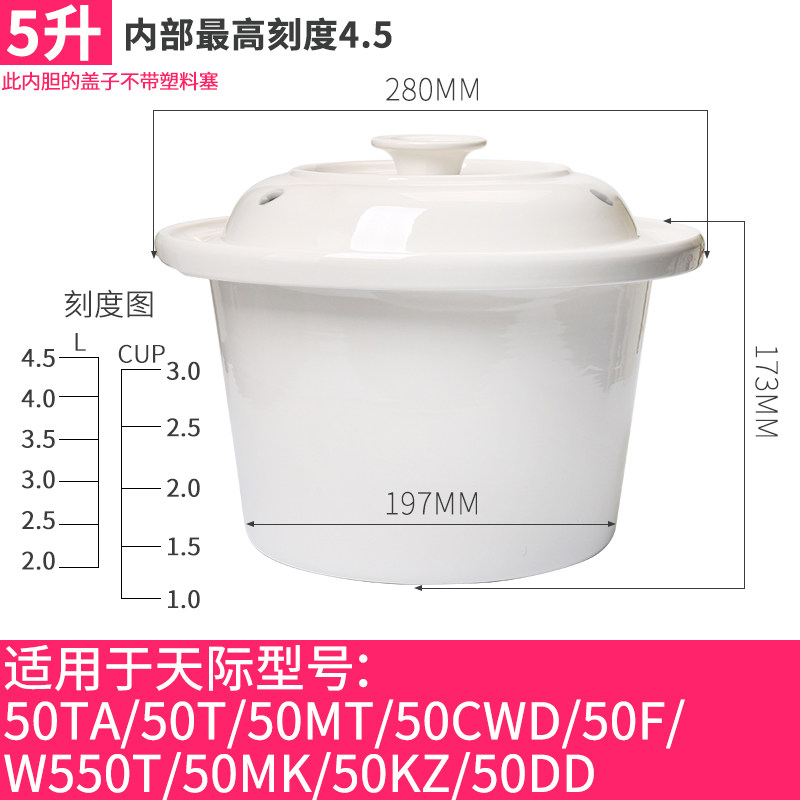 适配天际DGD50-50CWD煮粥锅电炖锅陶瓷内胆盖子配件原装白瓷5L升