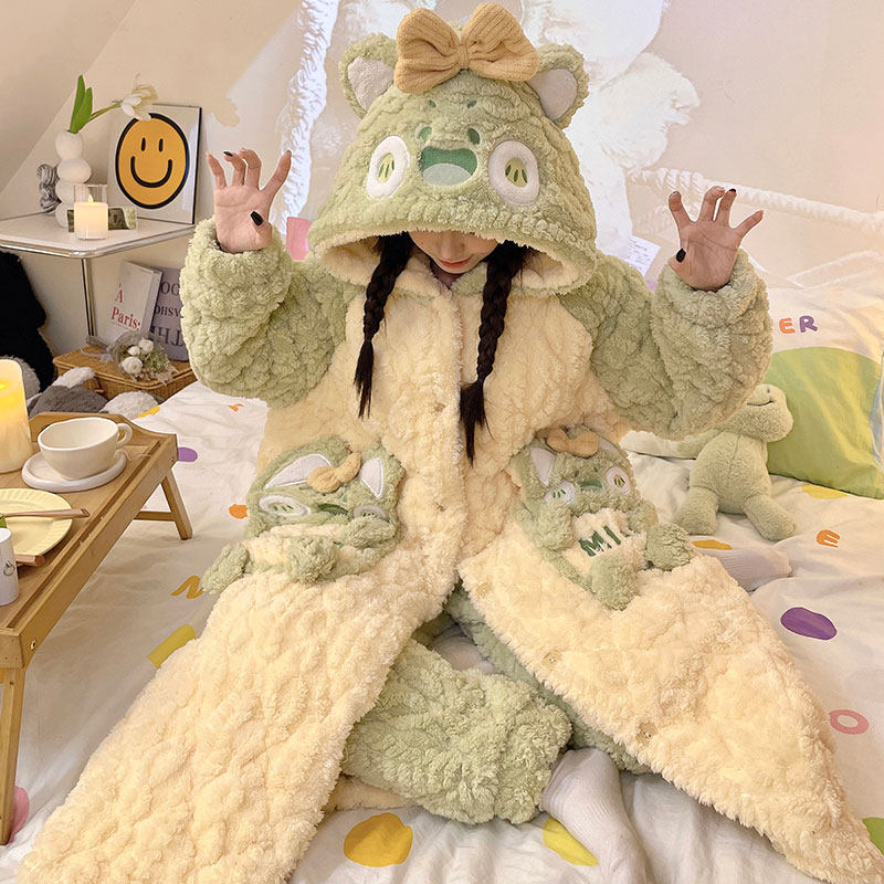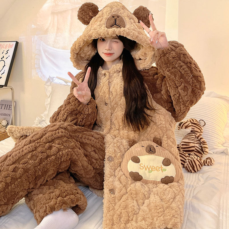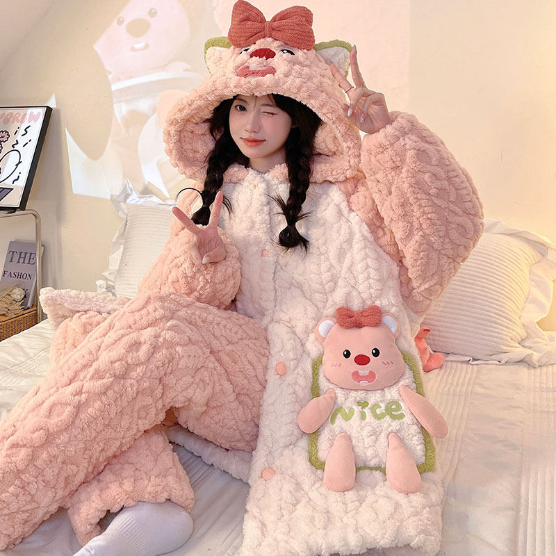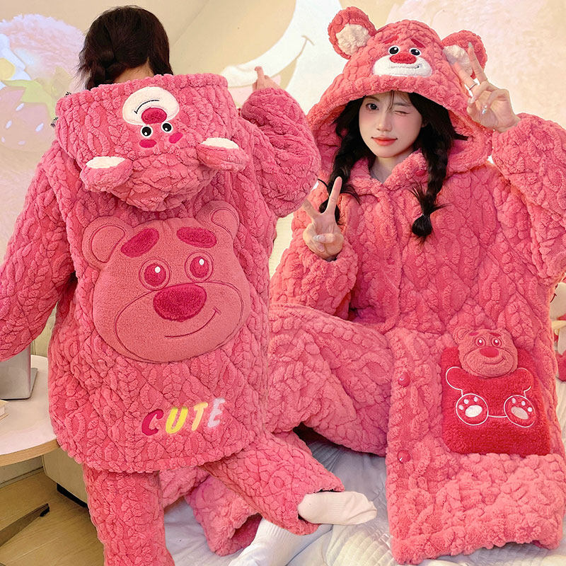 珊瑚绒睡袍冬款女可爱黄油小熊三层夹棉家居服睡衣冬季女加绒加厚