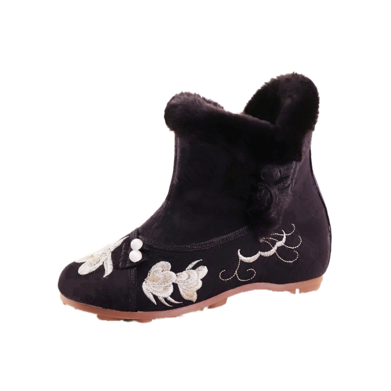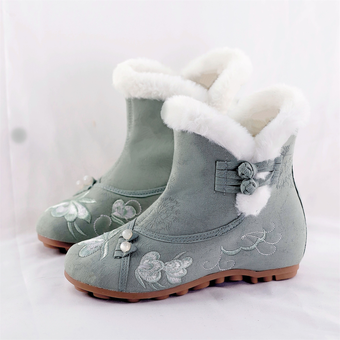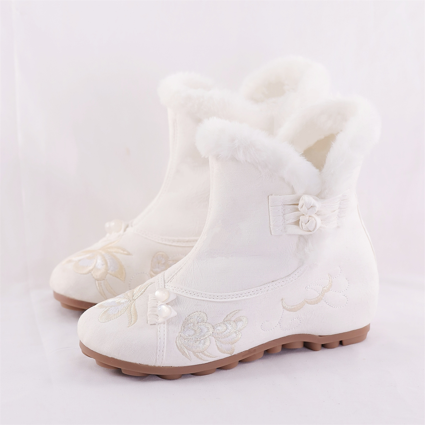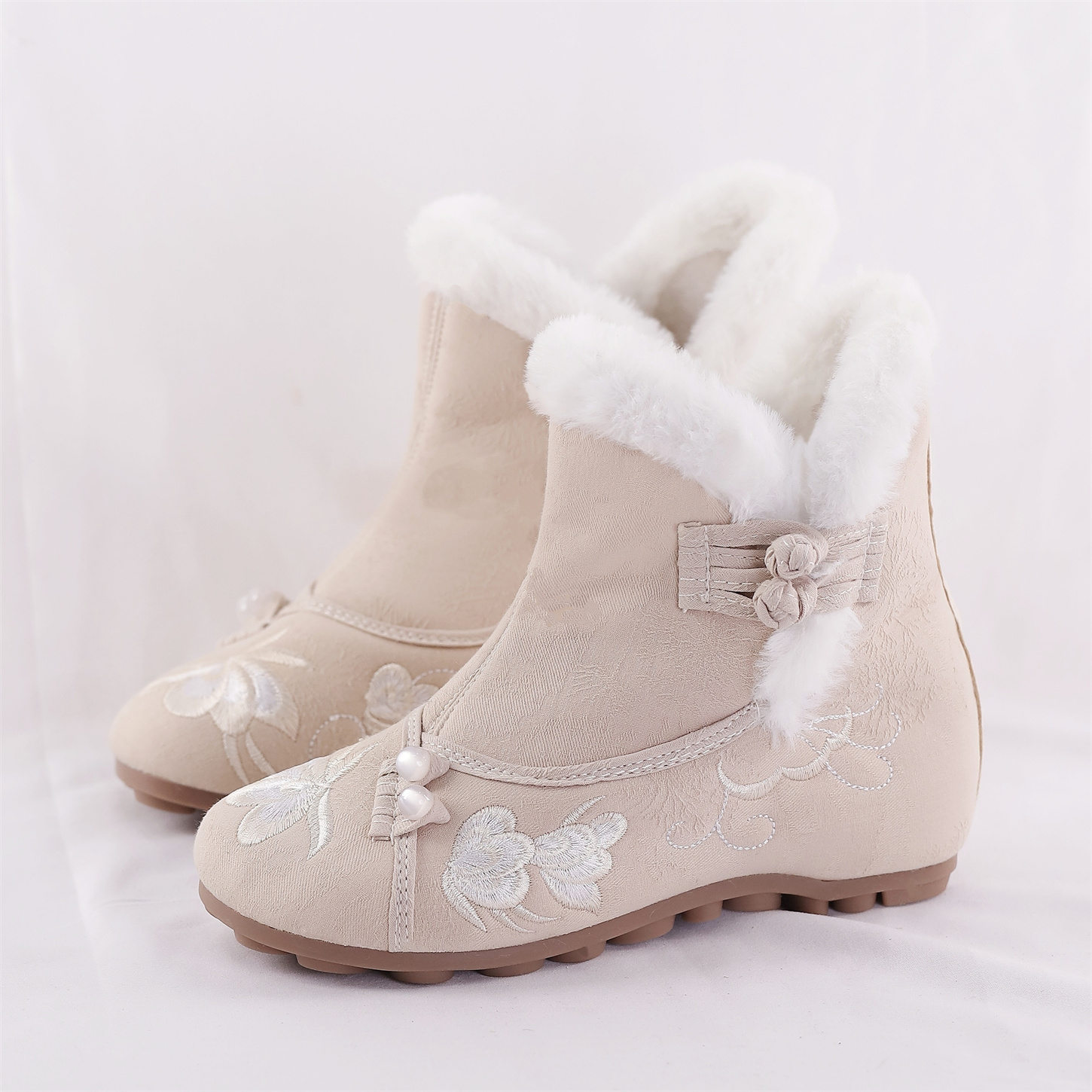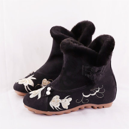 秋冬新款汉服靴子女古风古装靴内增高加绒棉靴中国风中筒绣花布靴
