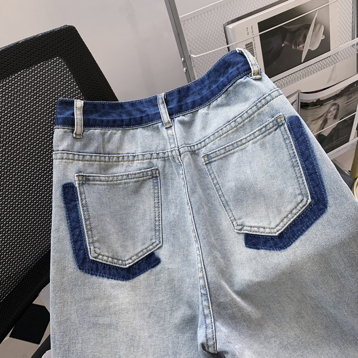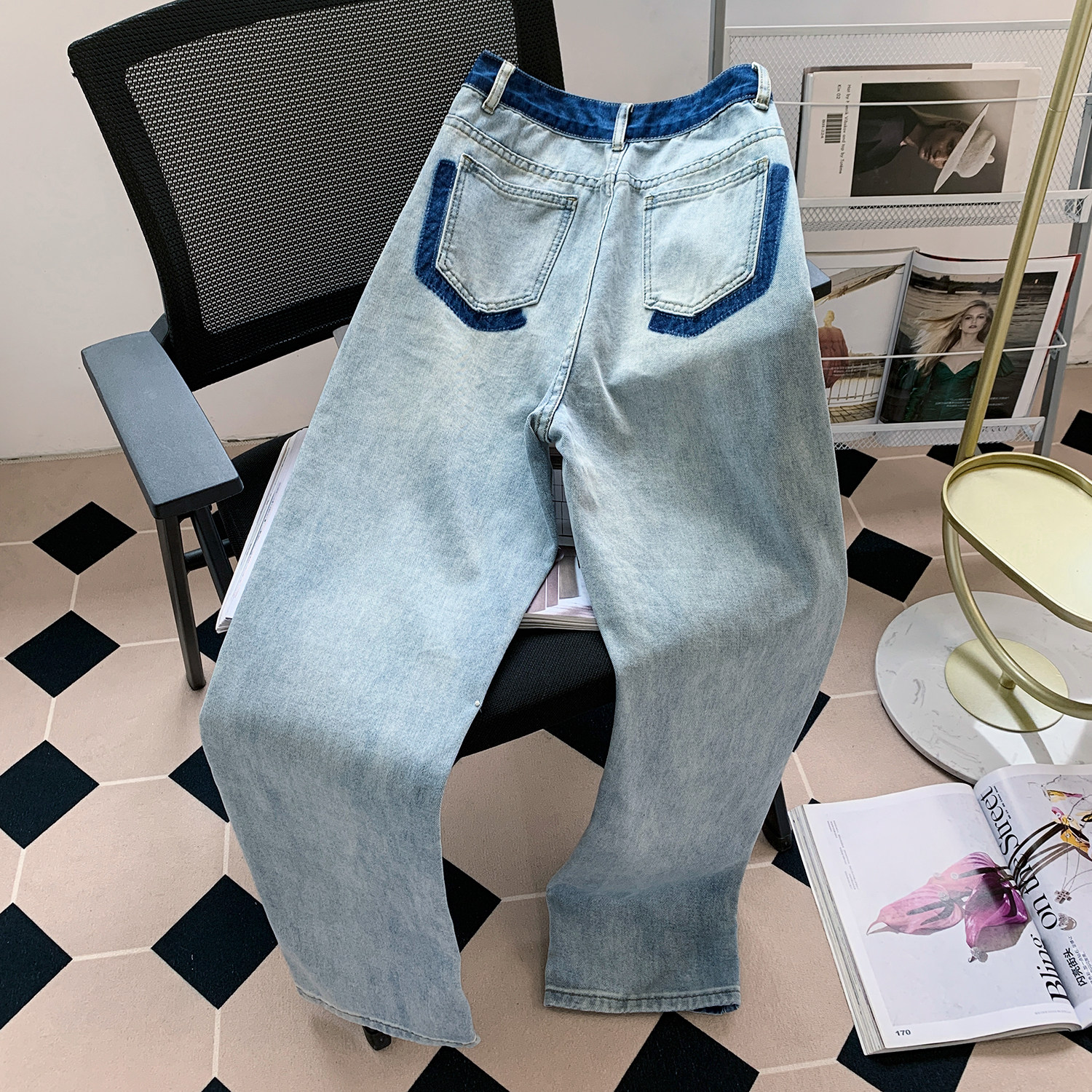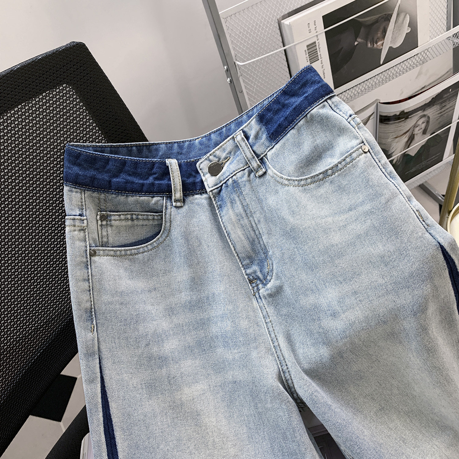 高腰阔腿牛仔裤女夏季薄款2024新款显瘦水洗撞色垂感宽松直筒裤子